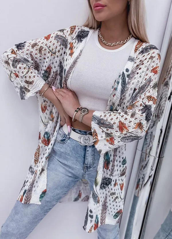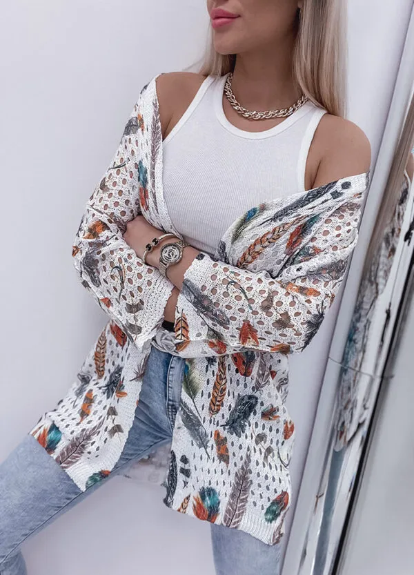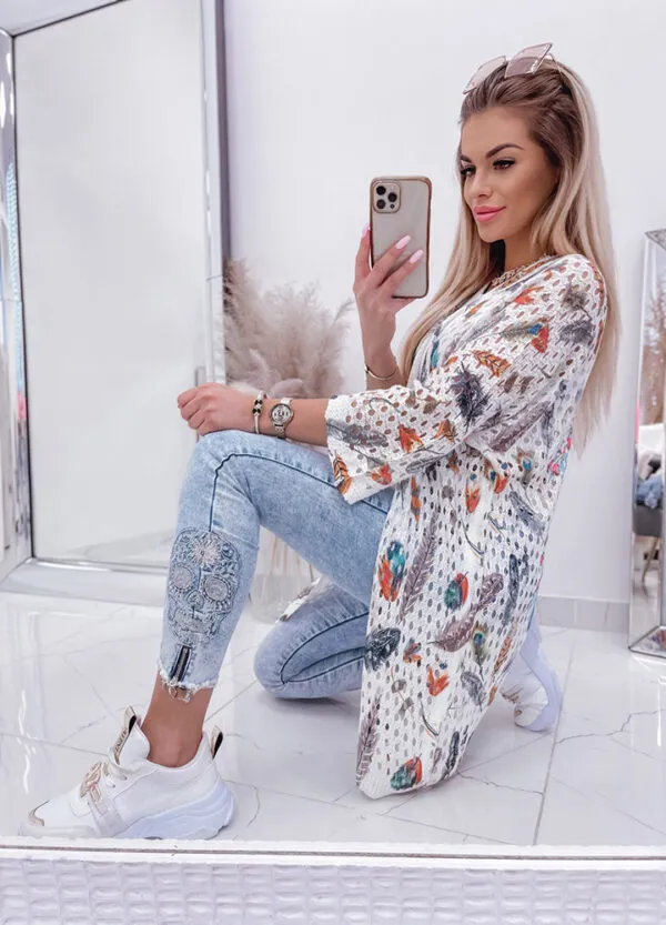 *Wzór: Kardigan w kolorze śmietankowy, ozdobiony kolorowym wzorem w pióra oraz łapacz snów na plecach