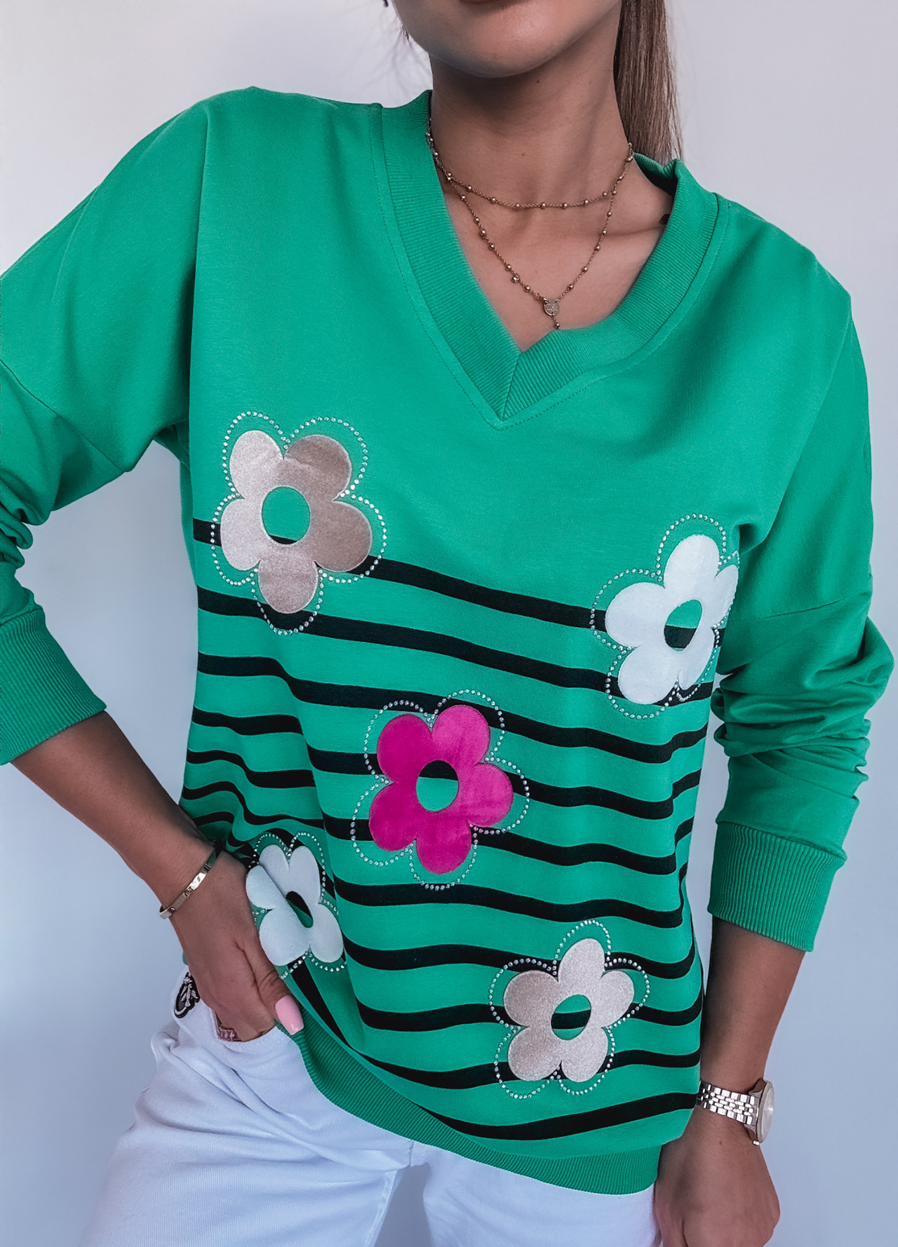 *Wzór: Bawełniana bluza w paski zdobiona cekinami.