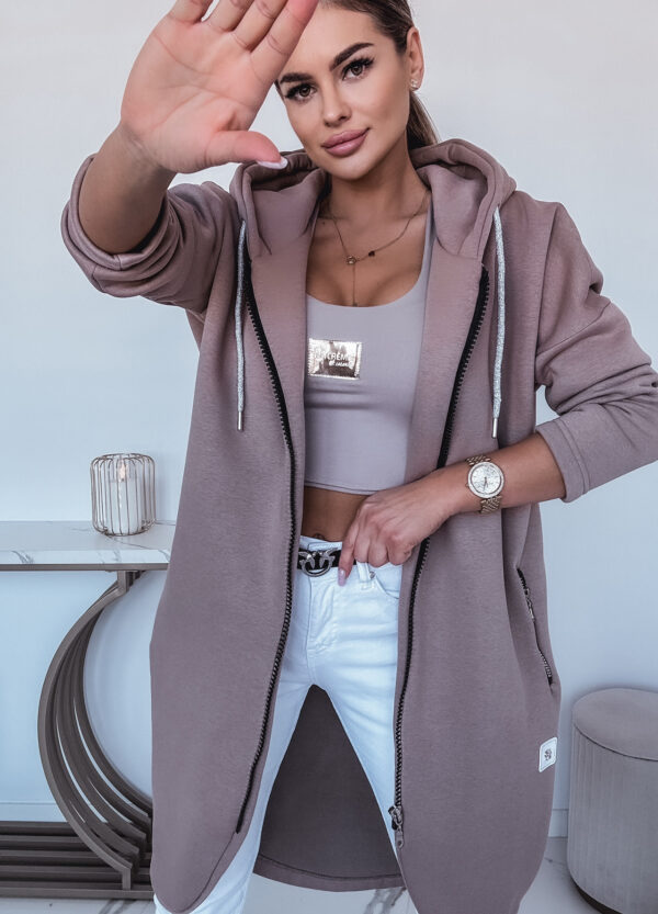 *Wzór: Bawełniana, długa bluza dresowa z kaputrem zapinana na suwak.
