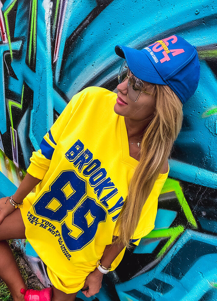 *Wzór: Bawełniana sukienka sportowa w kolorze zółtym z granatowym napisem.