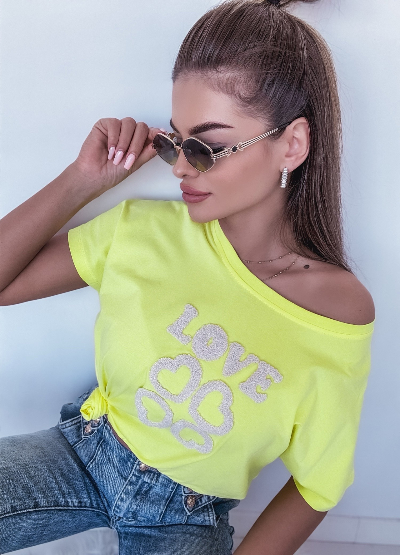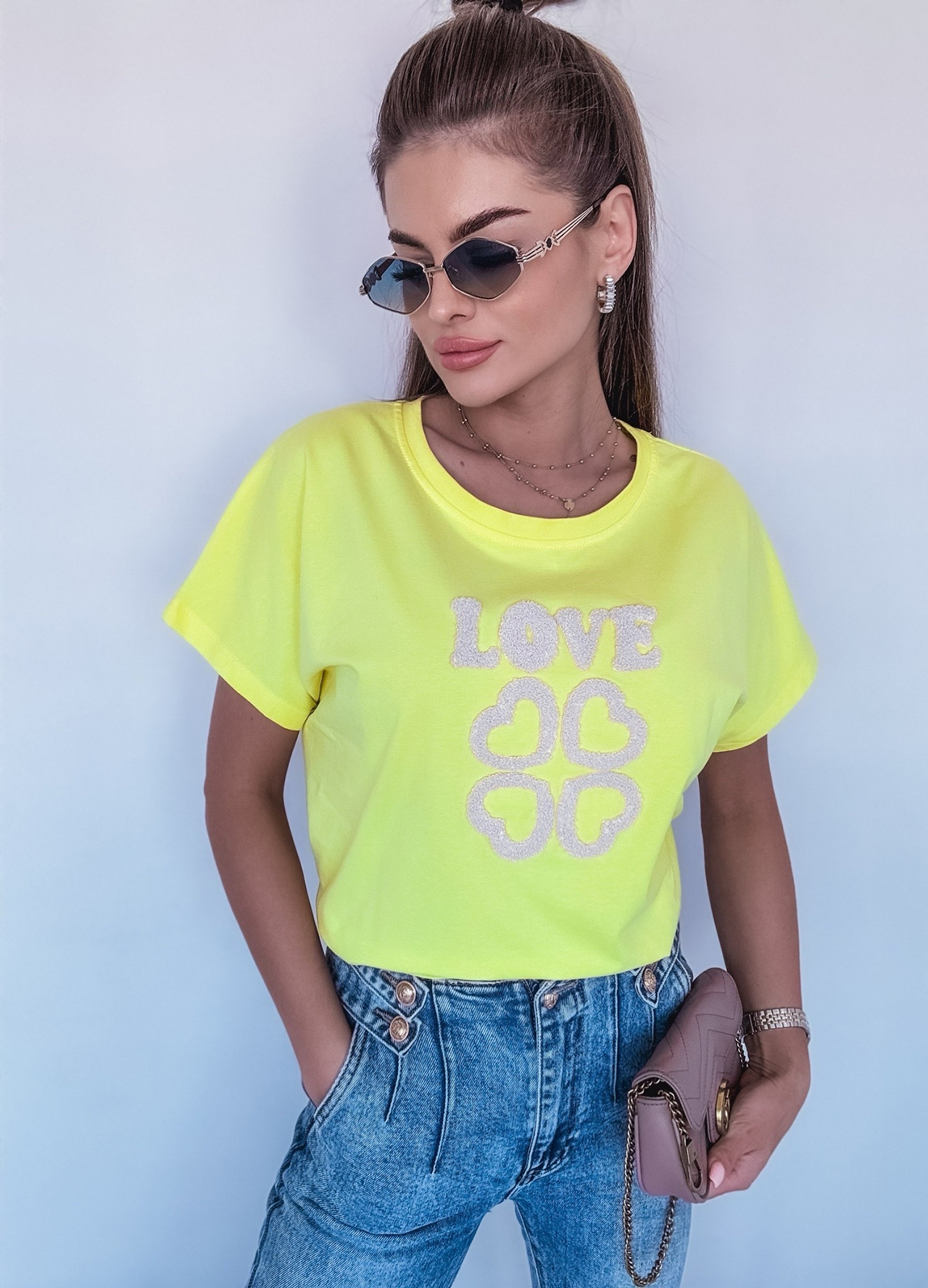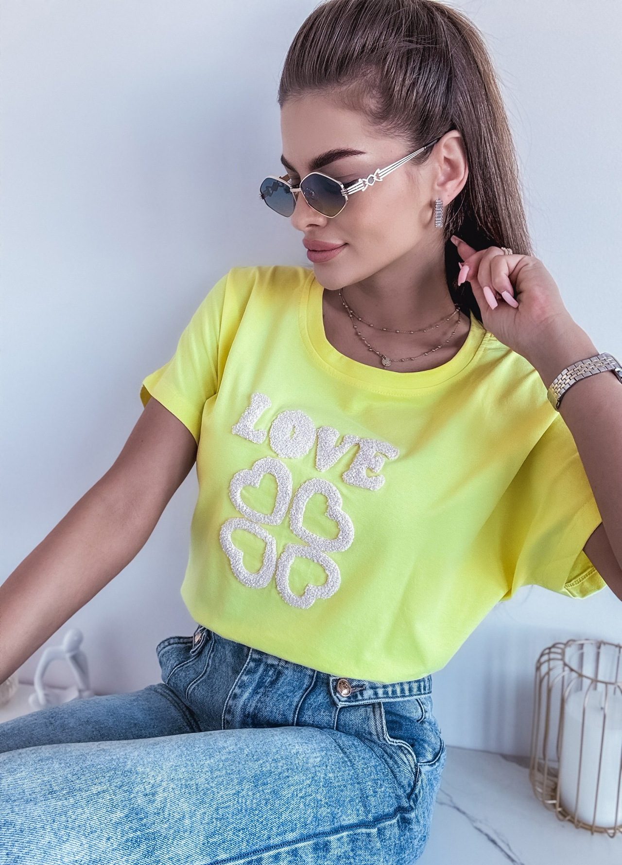 *Wzór: Bawełniana bluzka w kolorze żółtym z krótkim rękawkiem. Zdobiona aplikacją.