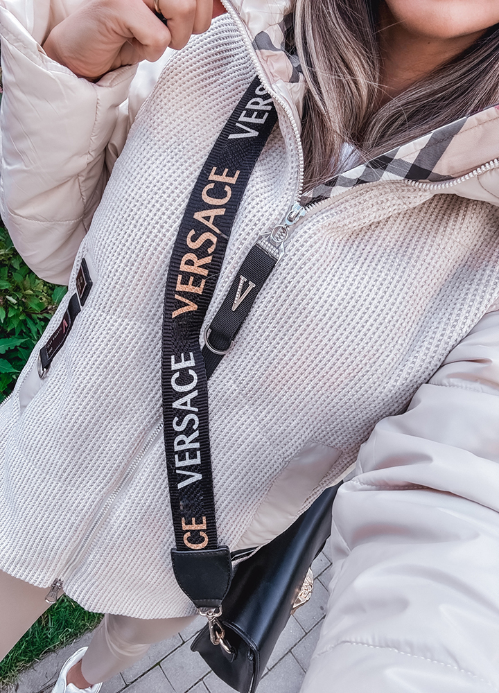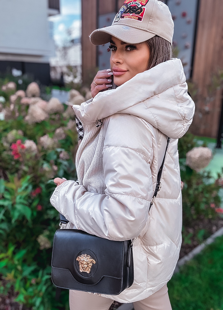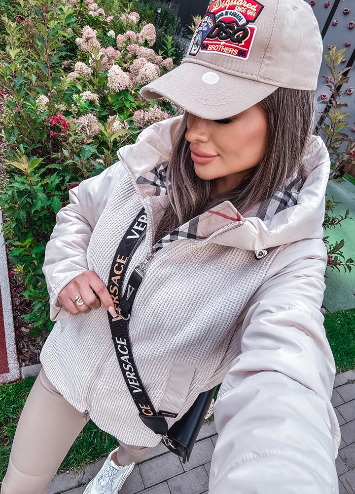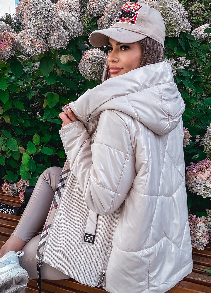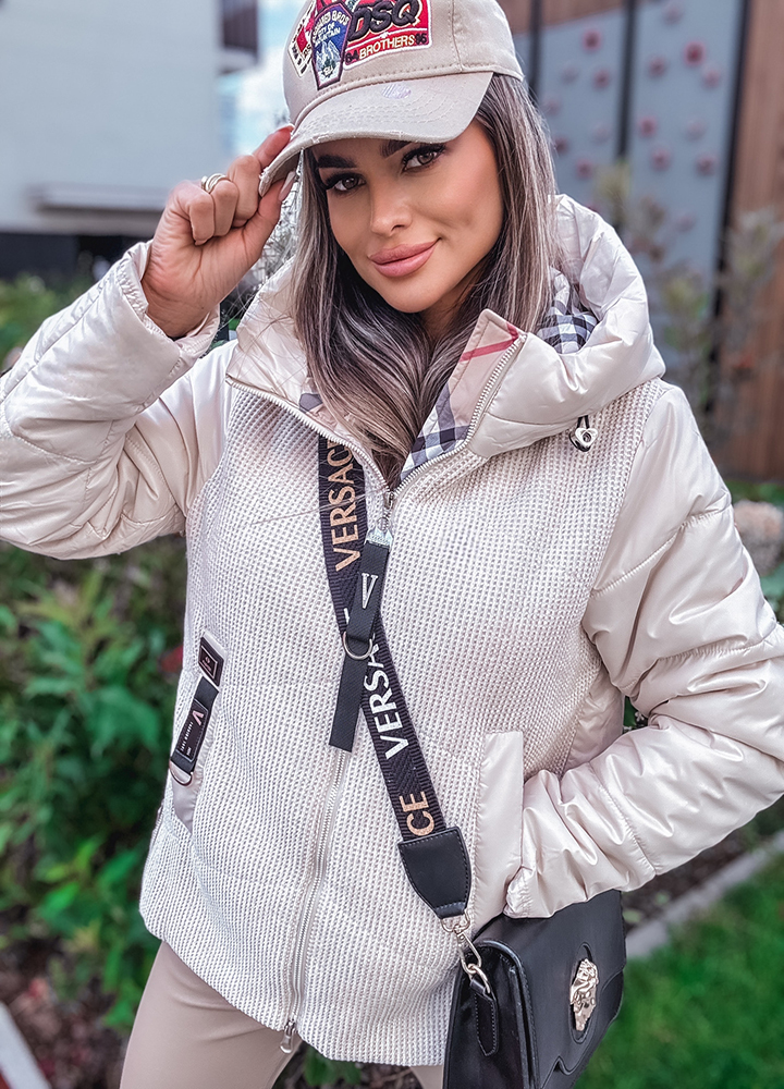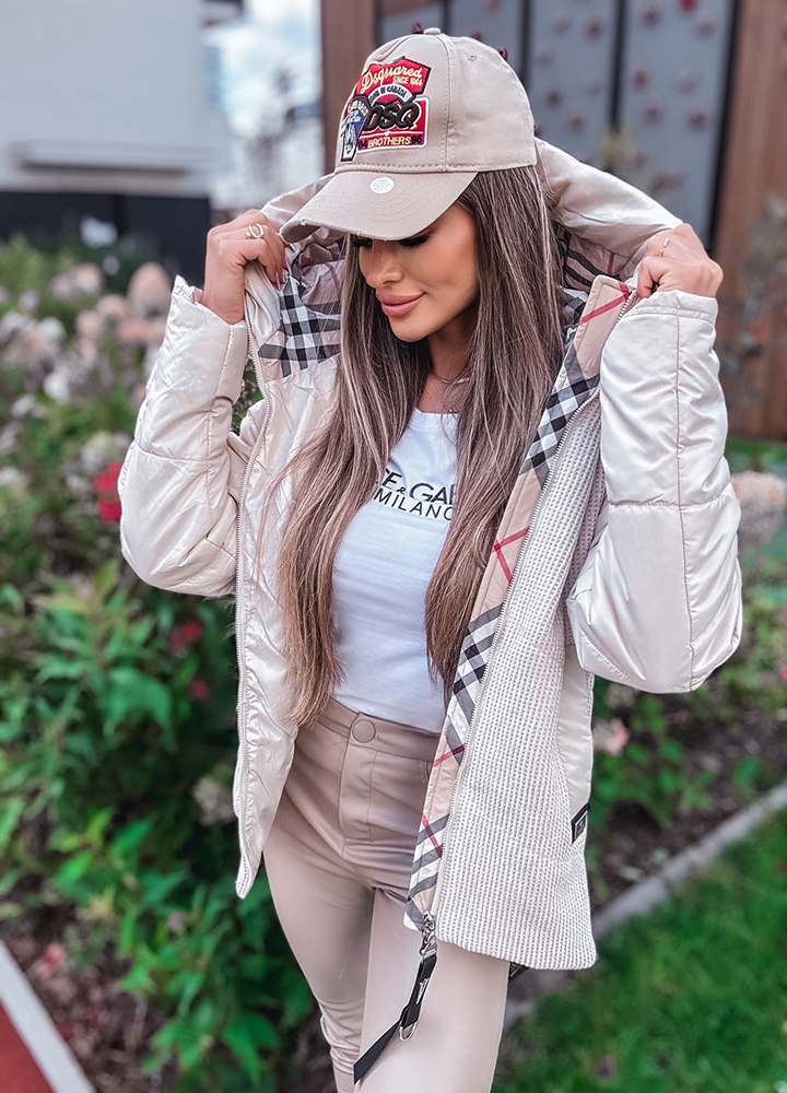 *Wzór: Beżowa kurtka z kapturem z wstawkami w kratkę zapinana na zamek