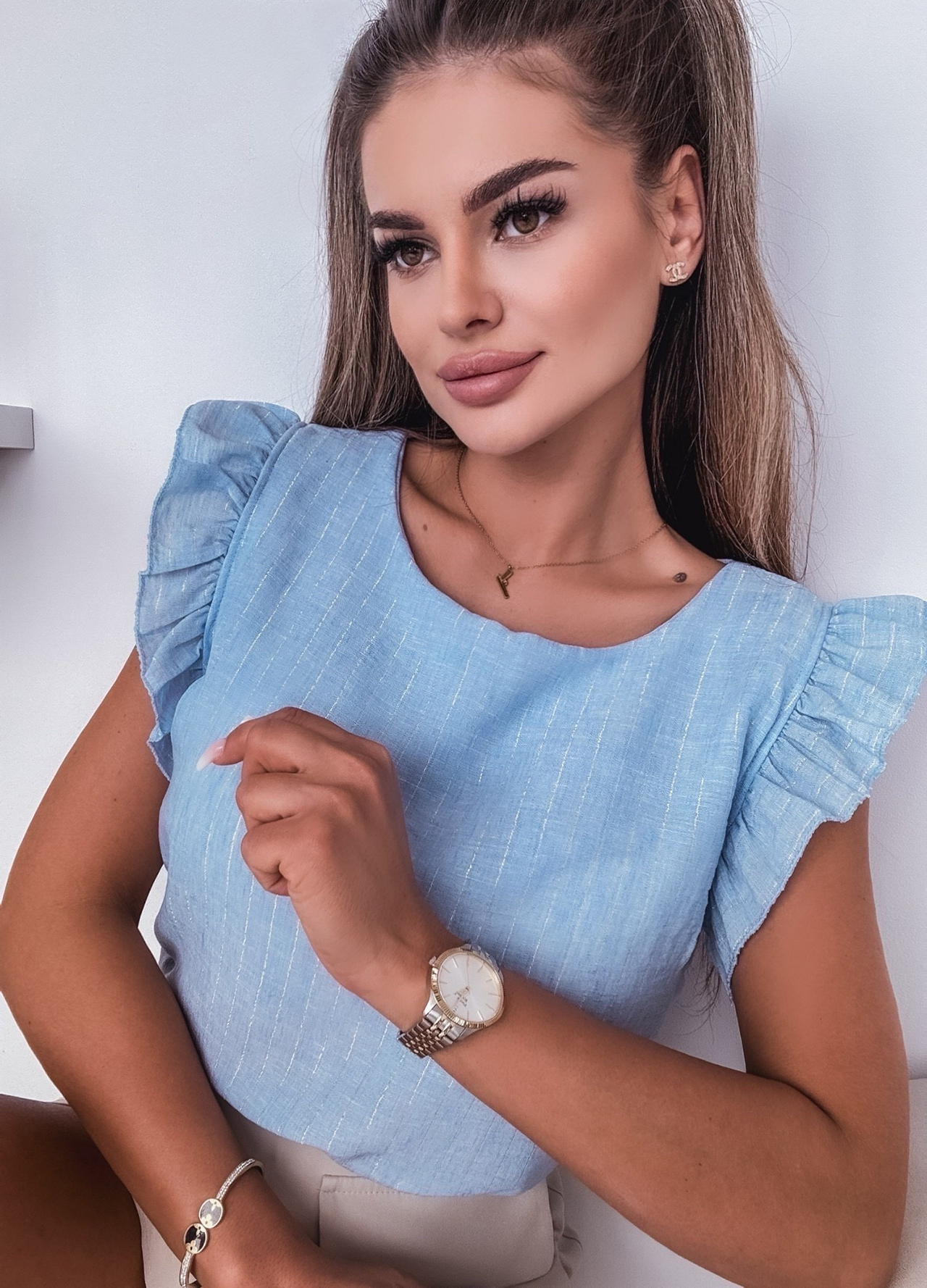 *Wzór: Letnia bluzka z krótkim rękawkiem zdobiony falbaną.