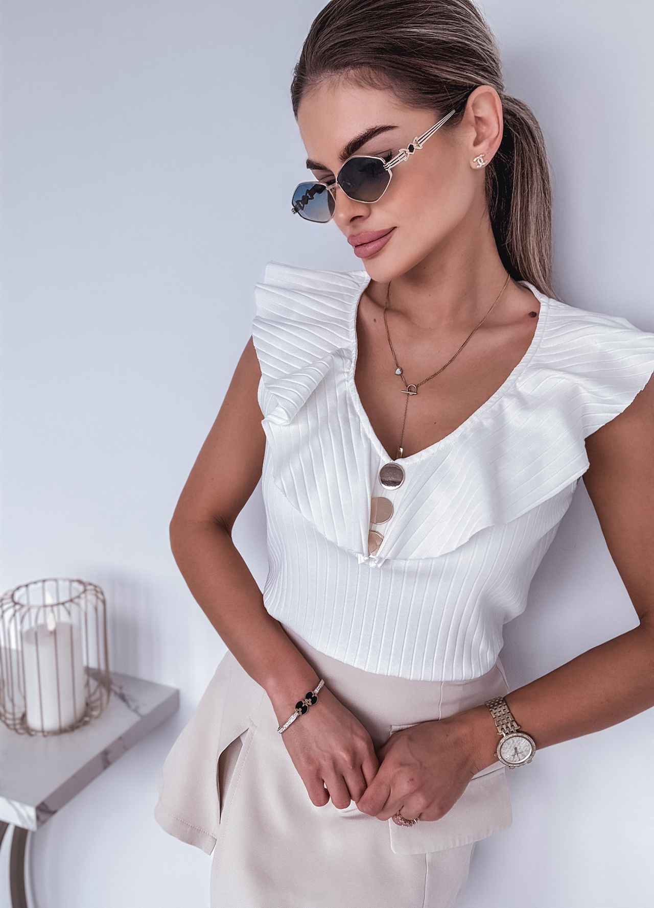 *Wzór: bawełniana bluzka na ramiączkach z falbaną.