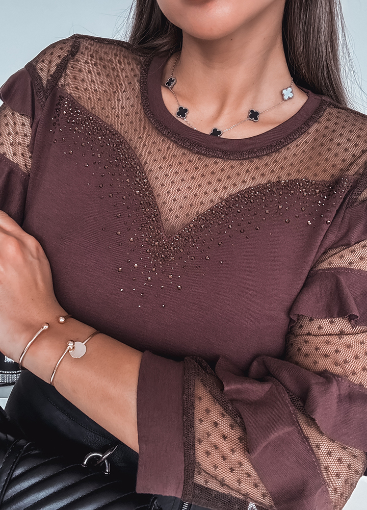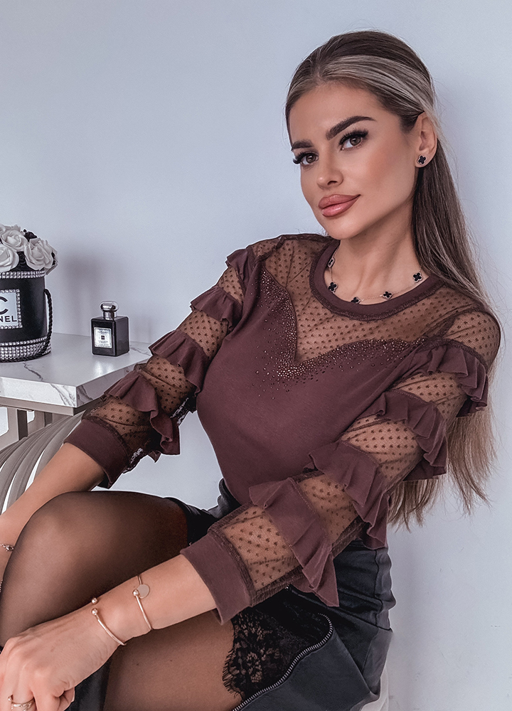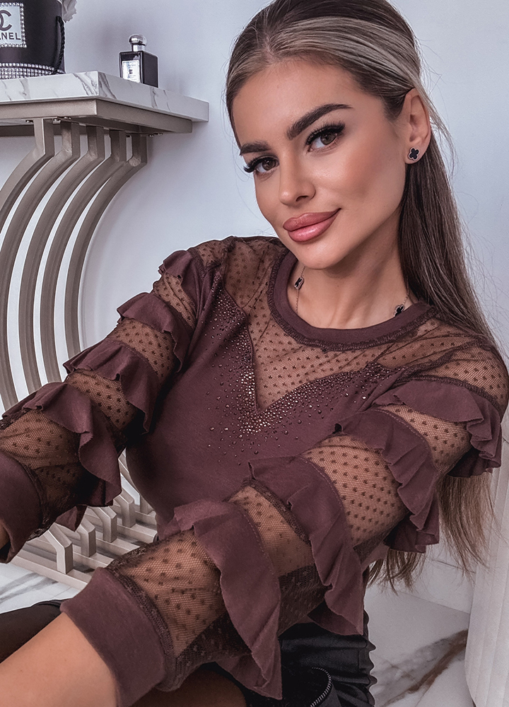 *Wzór: bluzka z efektownym dekoltem z cekinami i rękawami w falbanki