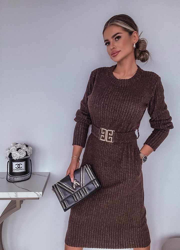 *Wzór: Sukienka midi czekoladowa z paskiem