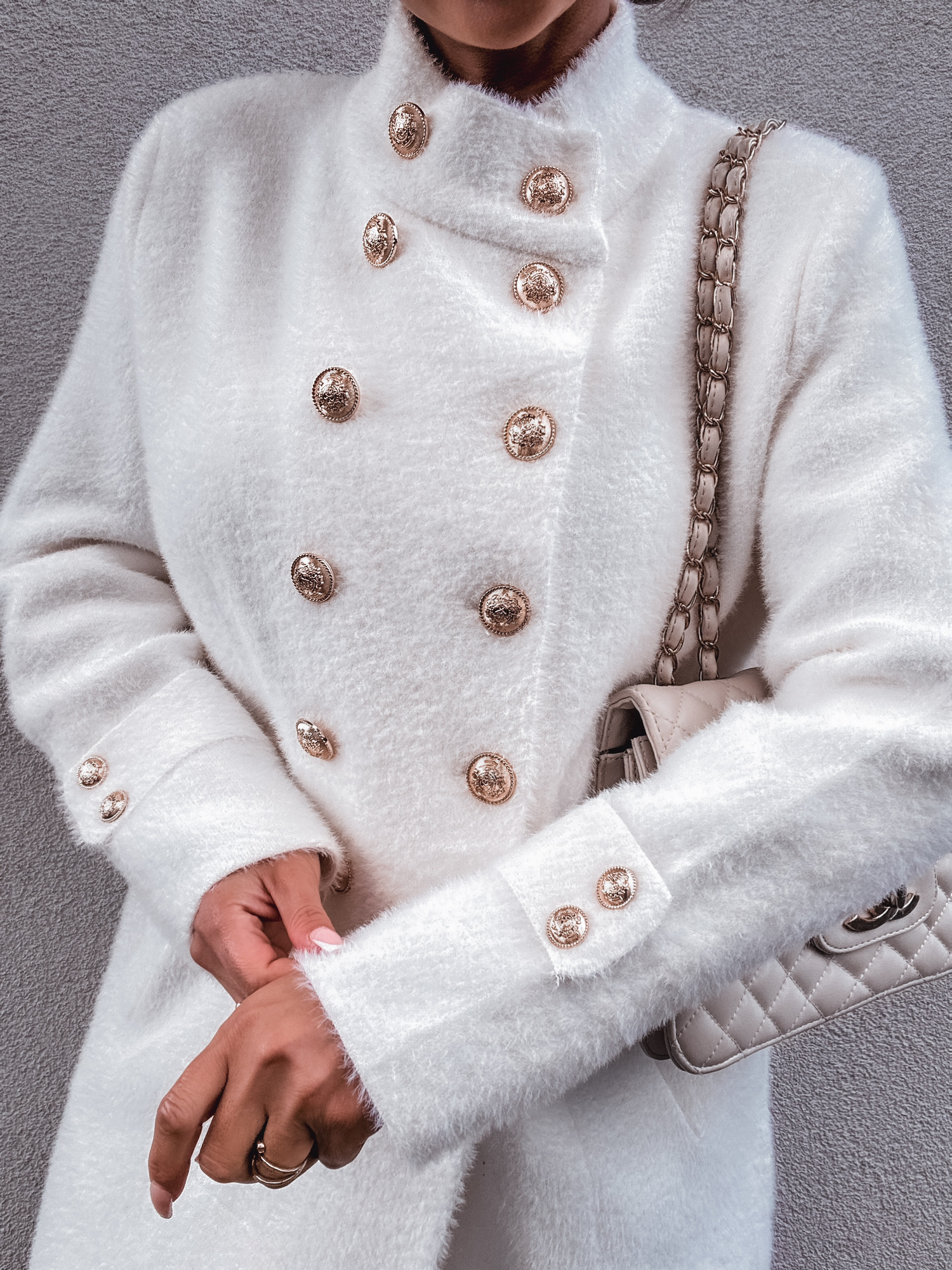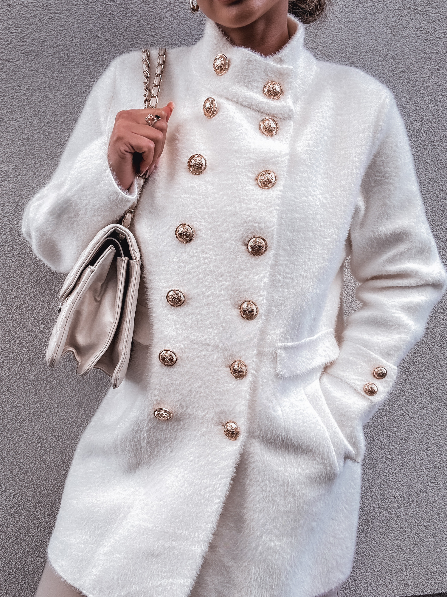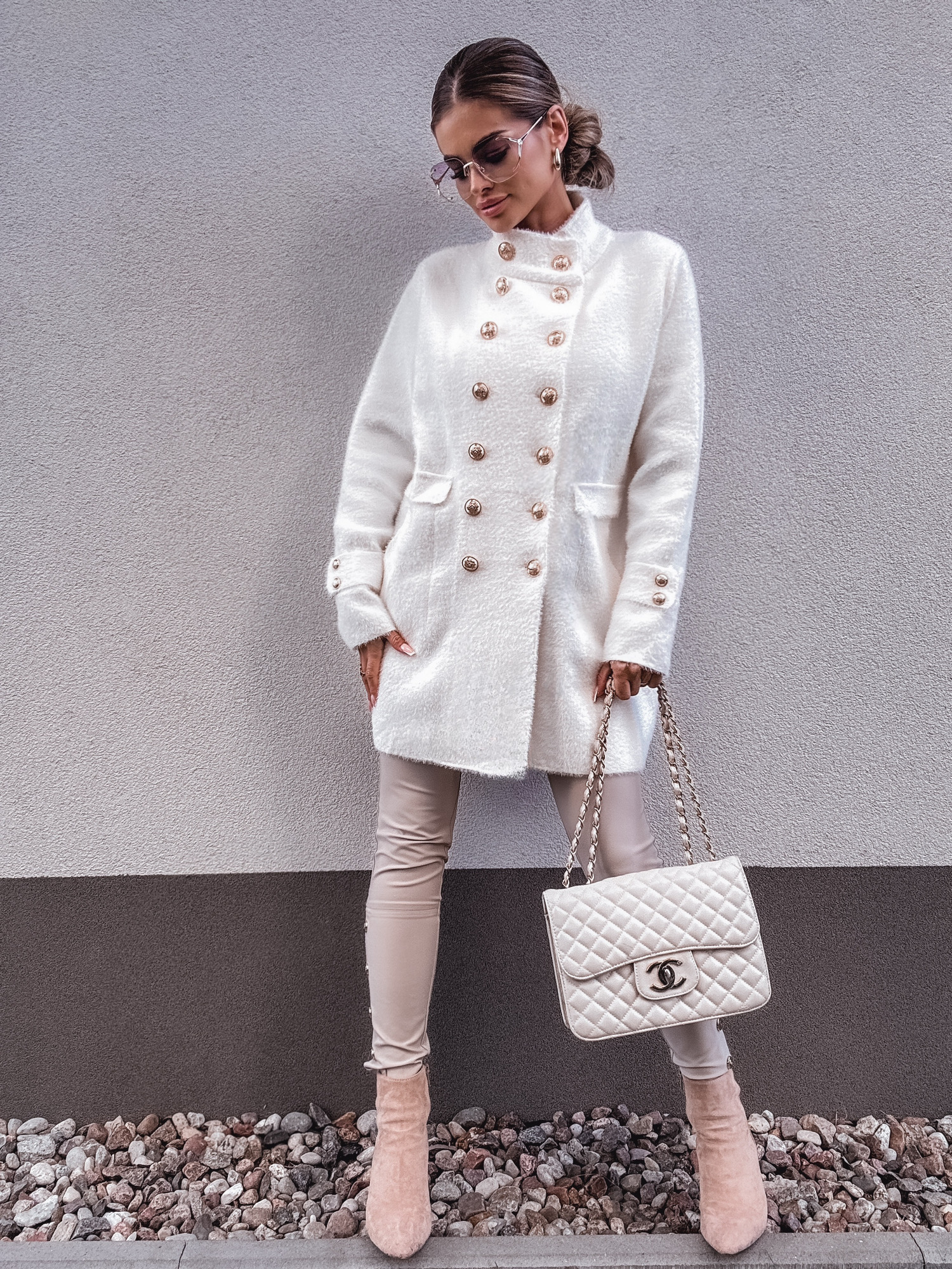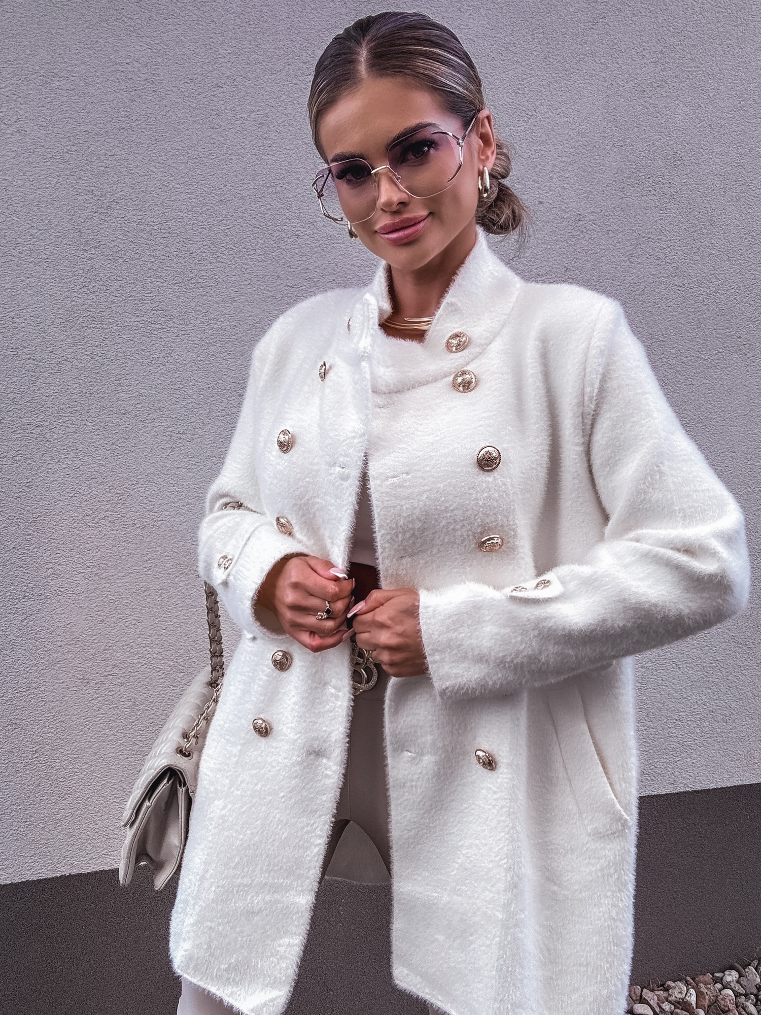 *Wzór: Płaszcz zapinany na złote guziki alpaka uszyta z miękkiego materiału z dodatkiem wełny i angory, rozmiar one size