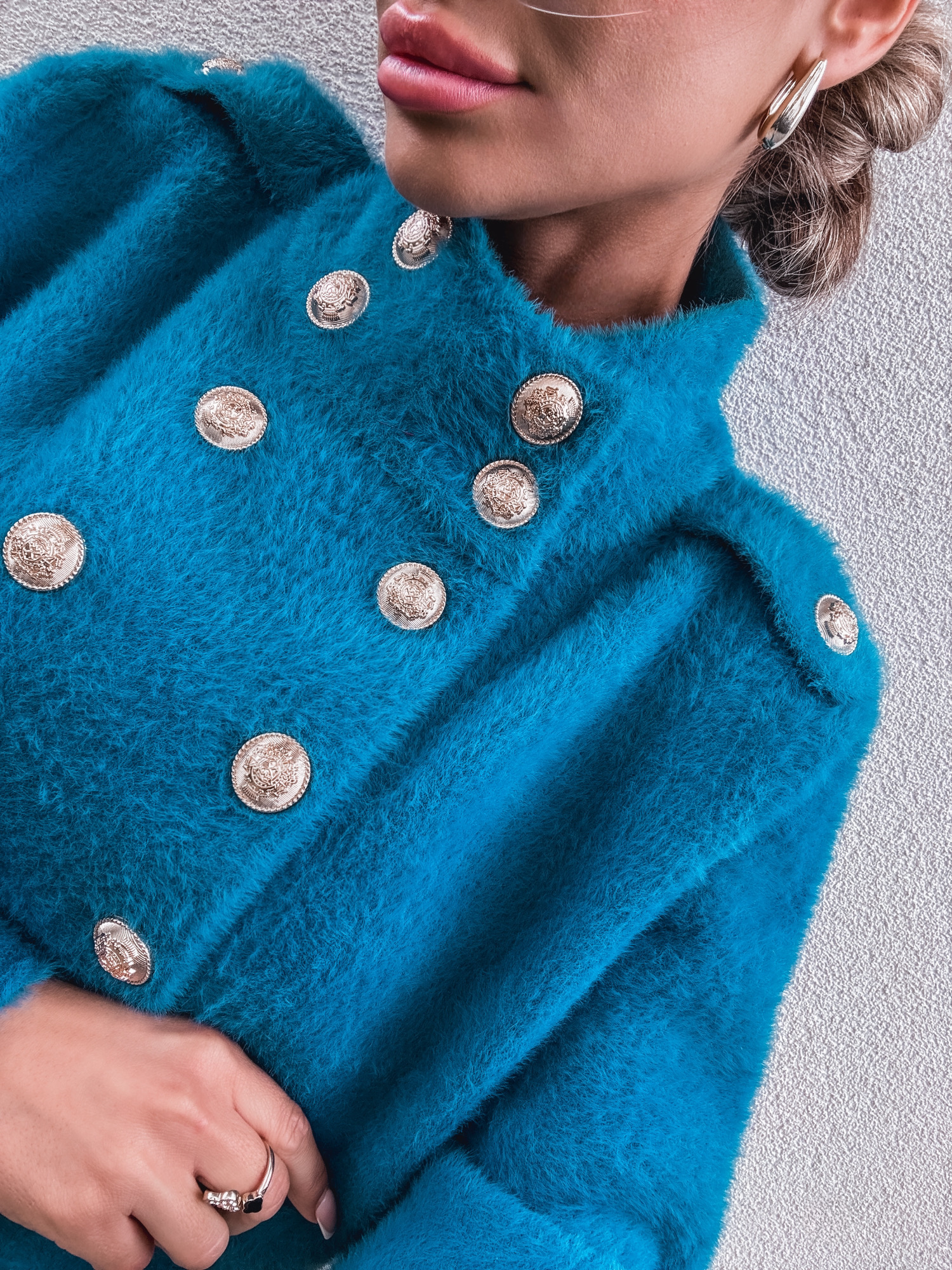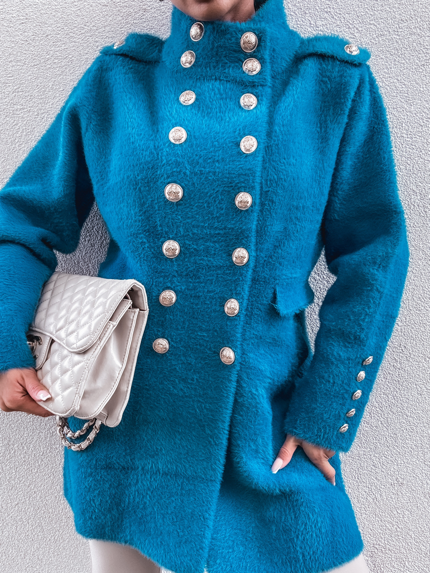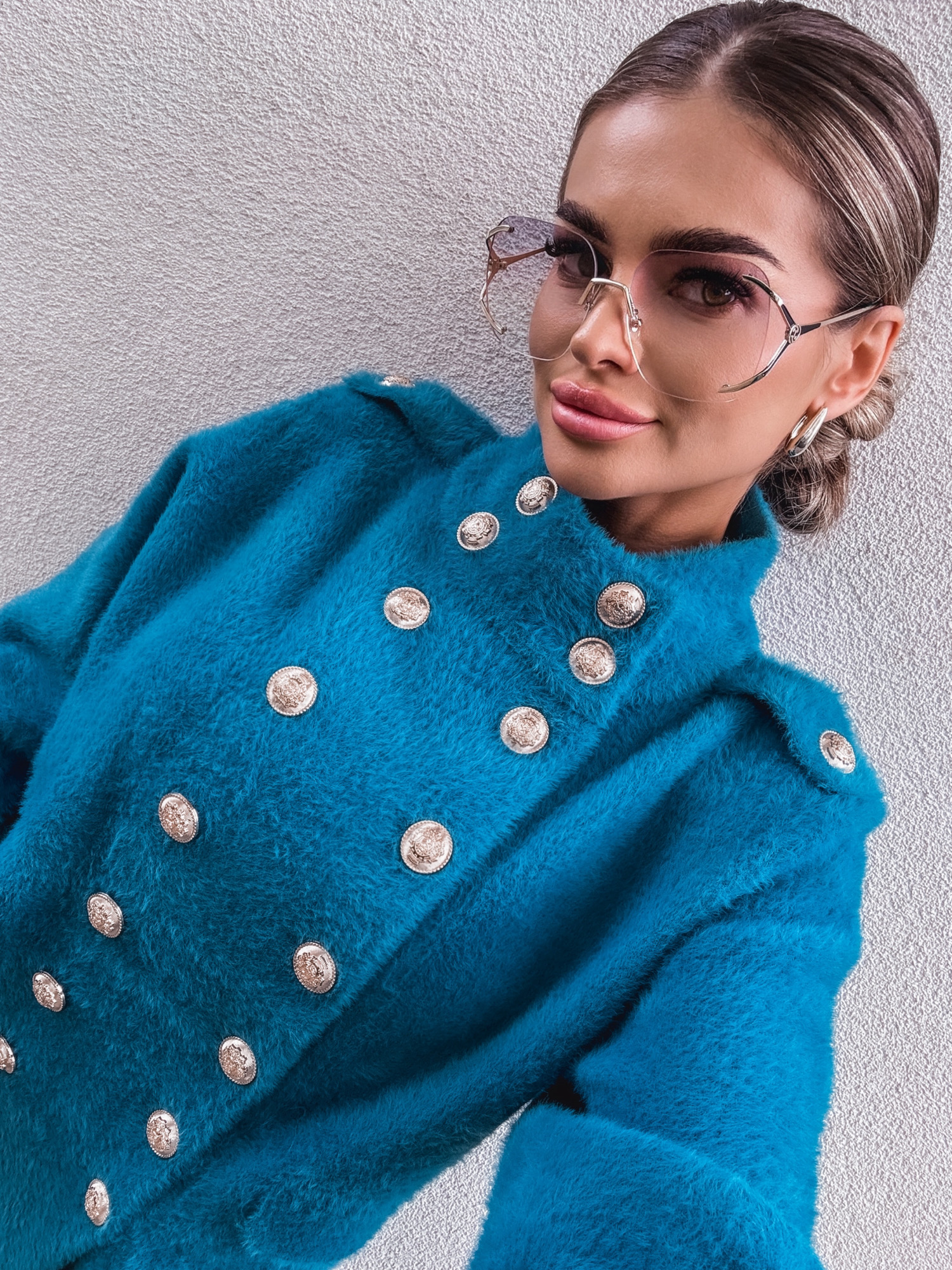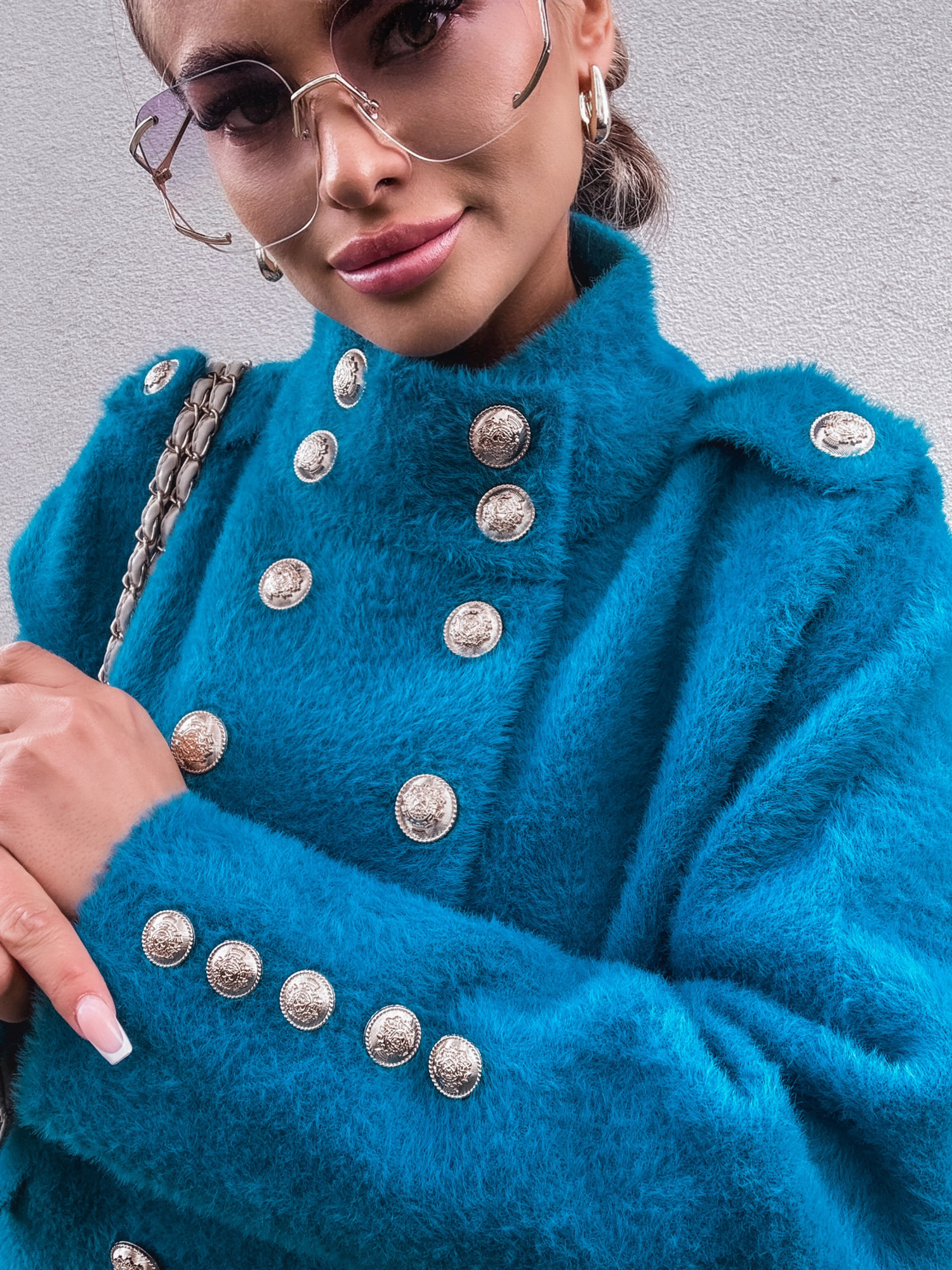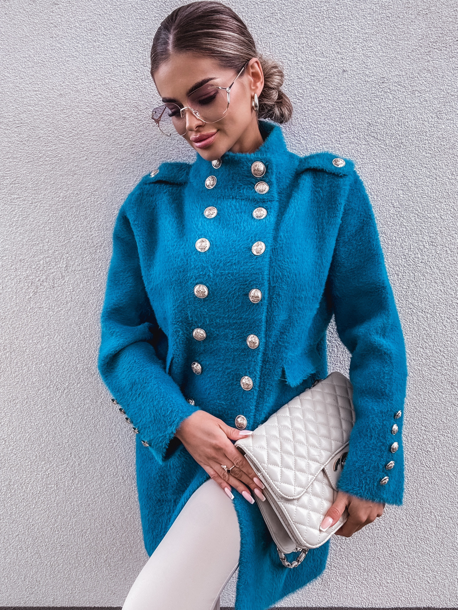 *Wzór: Płaszcz zapinany na złote guziki alpaka uszyta z miękkiego materiału z dodatkiem wełny i angory, rozmiar one size