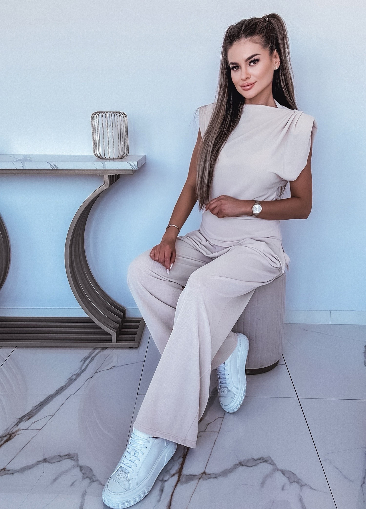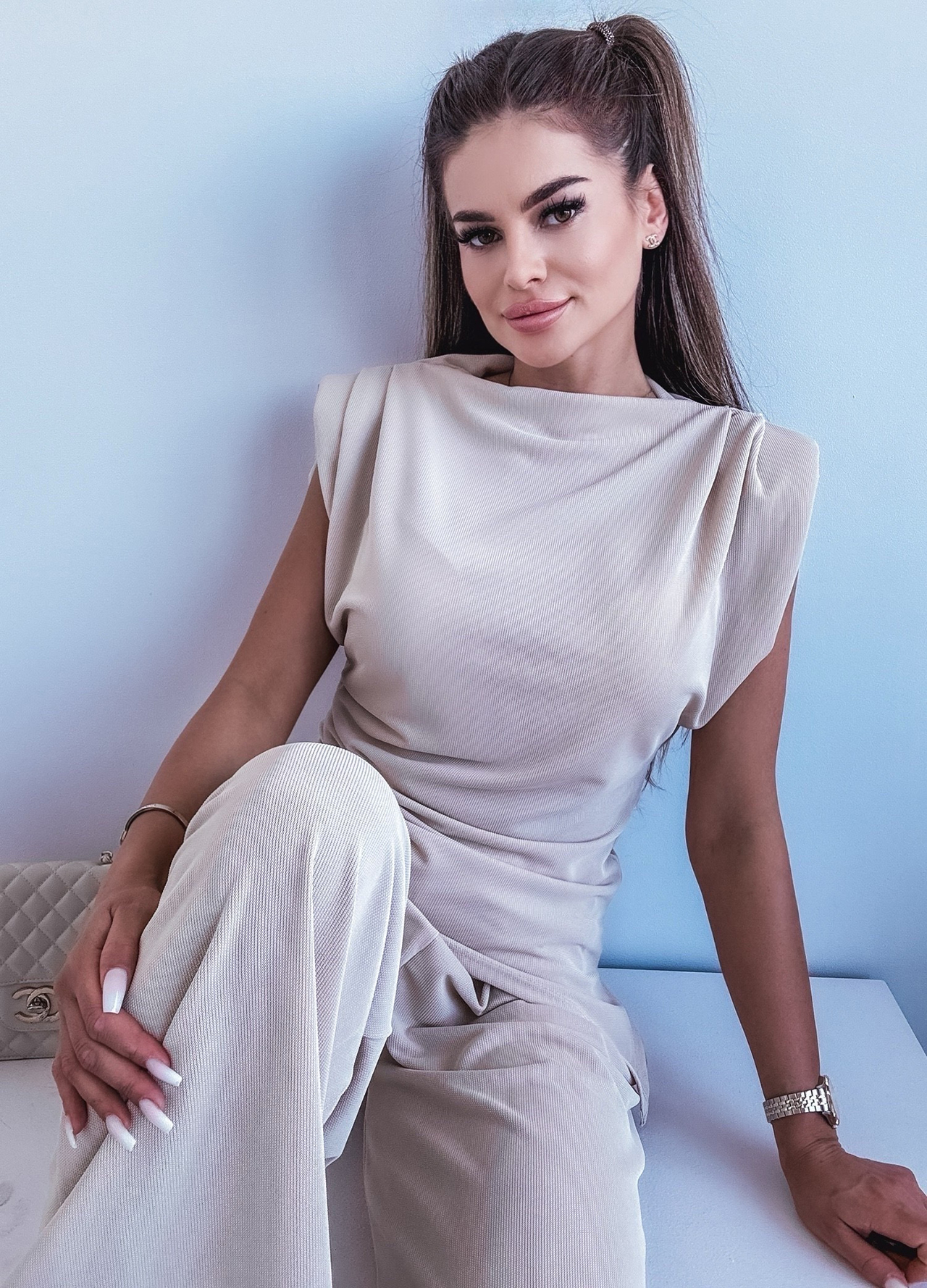 *Szczegóły: Komplet bluzka z drapowaniem + spodnie z szeroką nogawką w kolorze khaki.