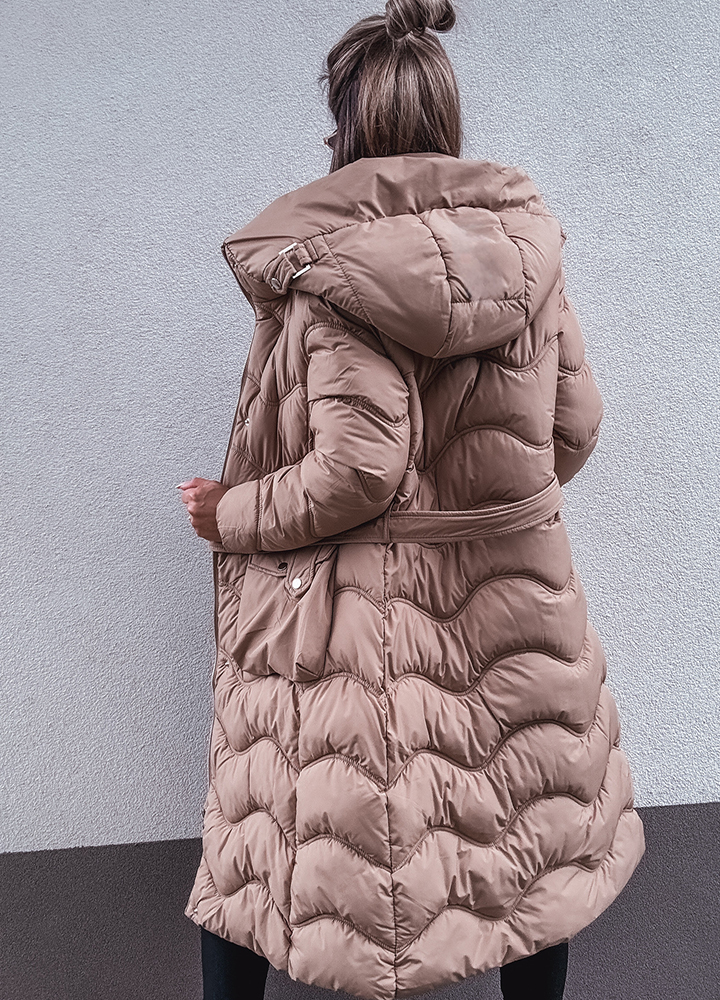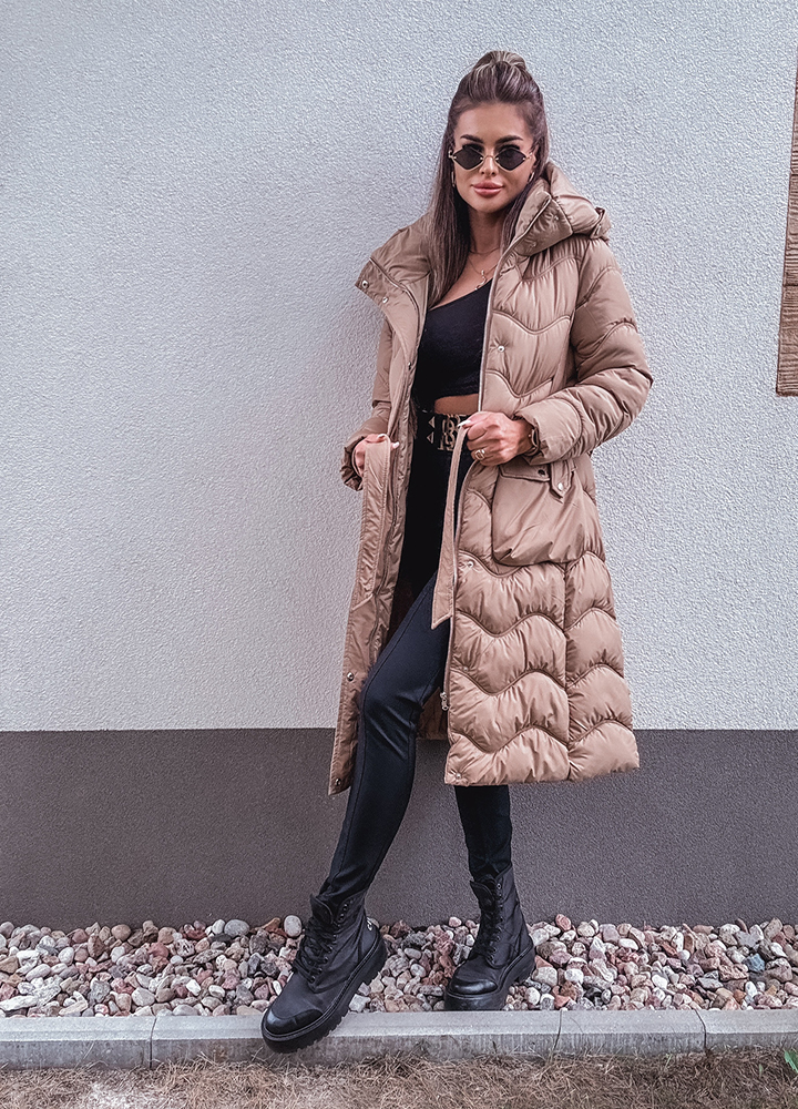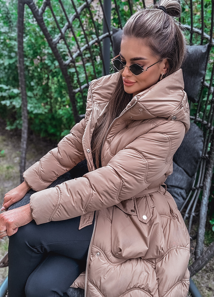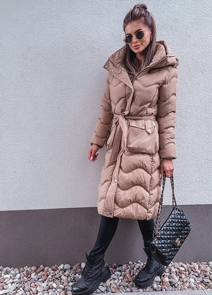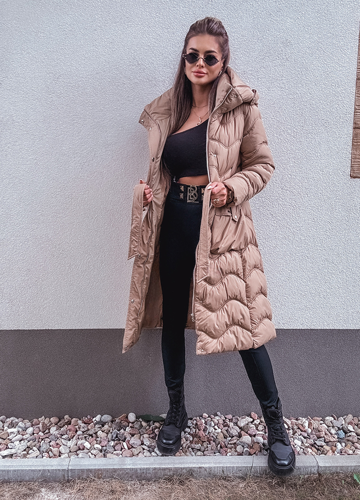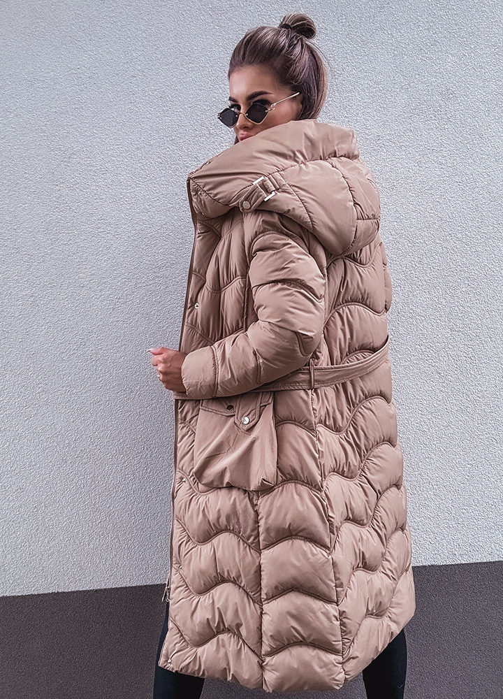 *Wzór: Pikowany beżowy płaszcz z kapturem zapinany na zamek i butony długość za kolano