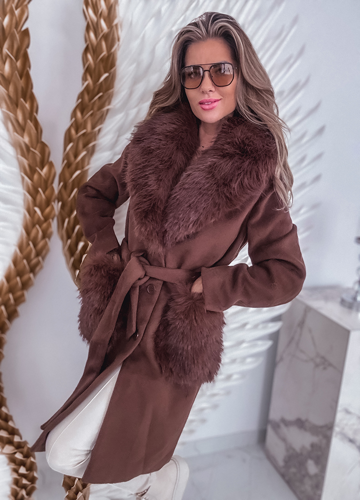 *Wzór: Płaszcz zapinany na guziki z paskiem ozdobiony futerkiem