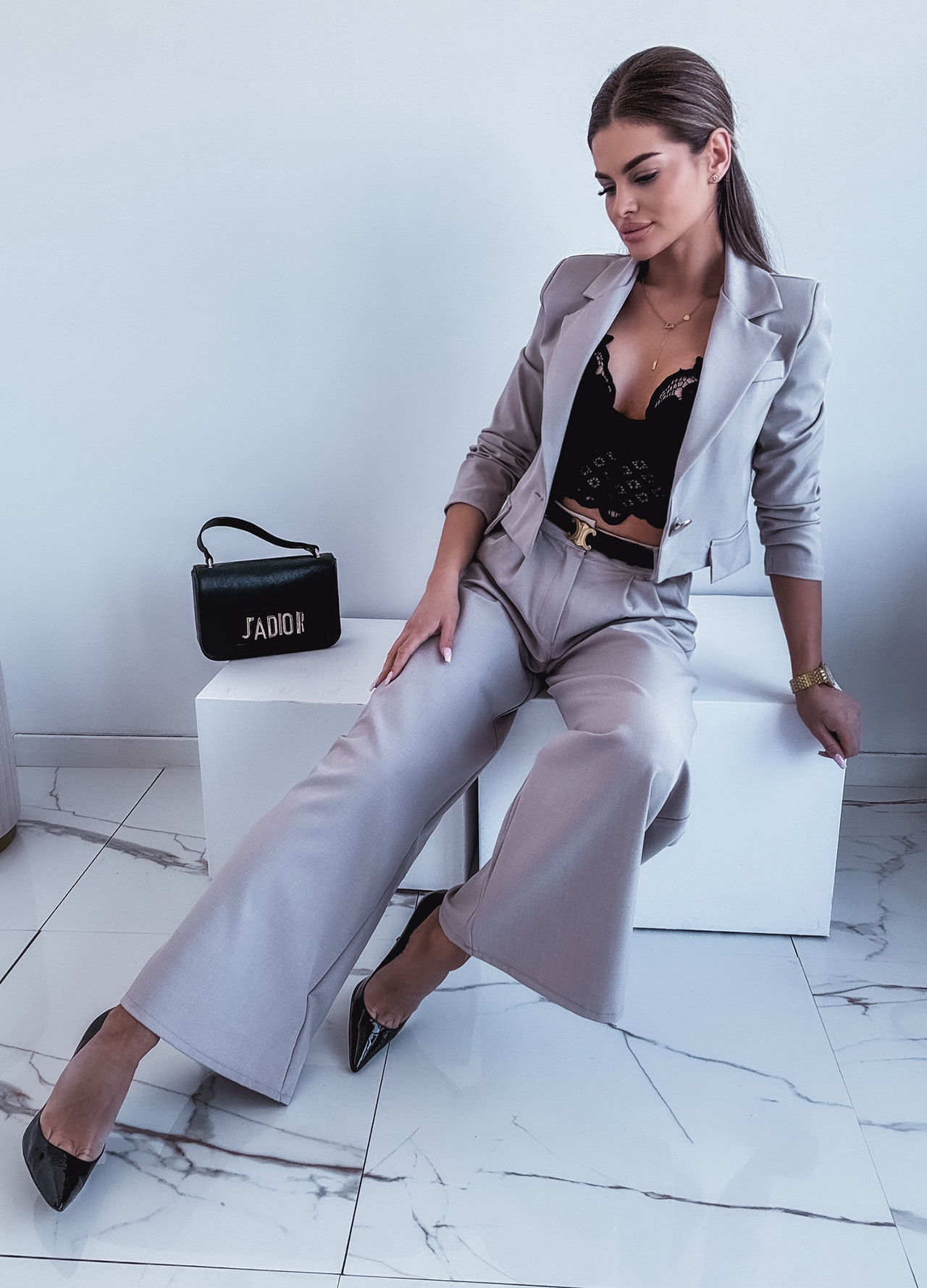 *Szczegóły: Garnitur damski w kolorze szarym. Żakiet + spodnie z szeroką nogawką.