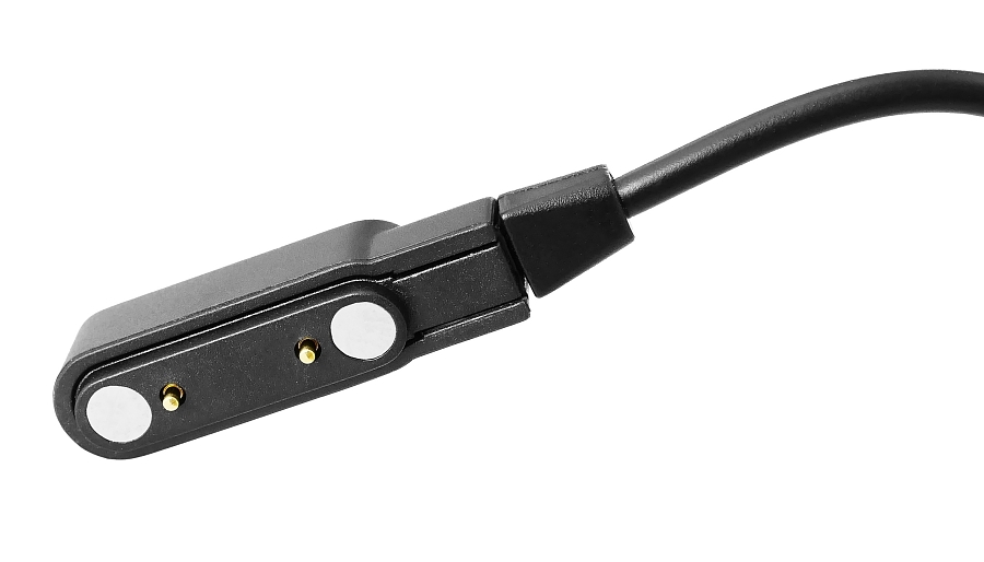 Funkcjonalny kabel ładujący z końcówką USB z jednej strony a z drugiej pinami, które są przyciągane magnesem. Zapewnia wygodne i stabilne ładowanie smartwatcha dzięki precyzyjnemu dopasowaniu oraz mocnemu magnesowi.