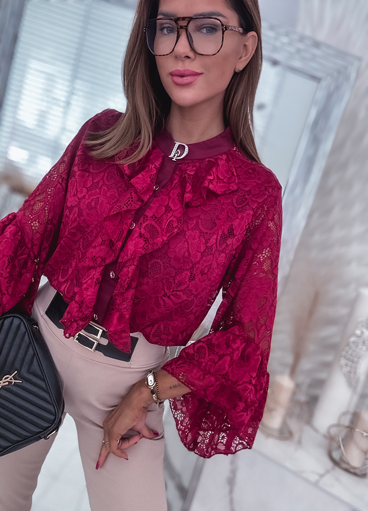 *Wzór: elegancka czekoladowa koszula z żabotem i broszką