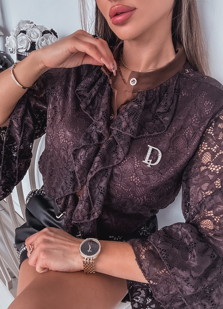 *Wzór: elegancka czekoladowa koszula z żabotem i broszką