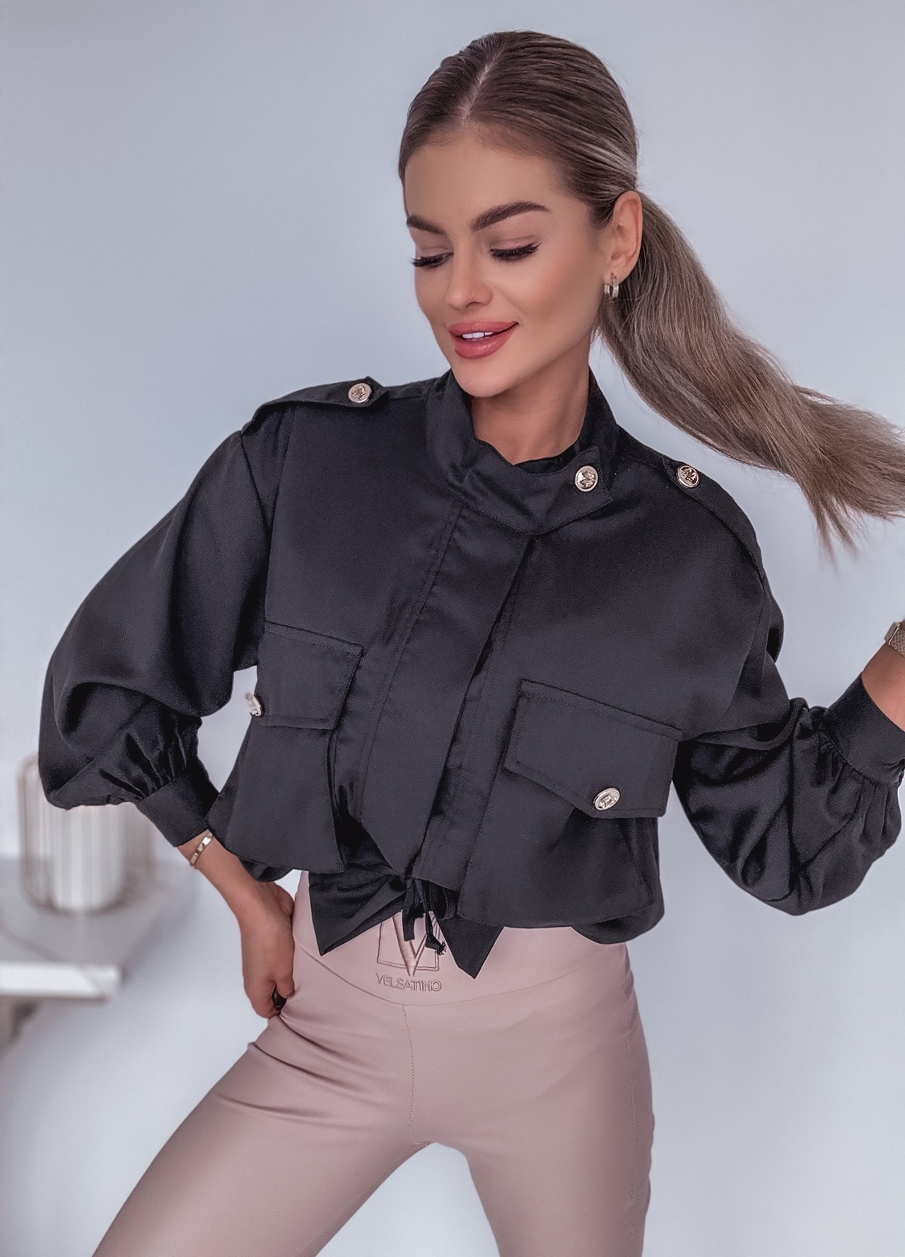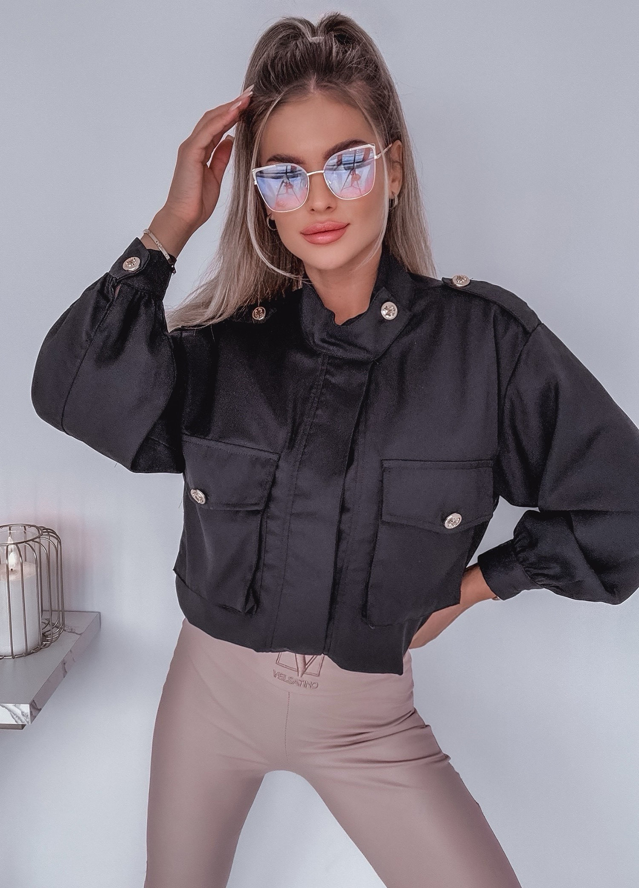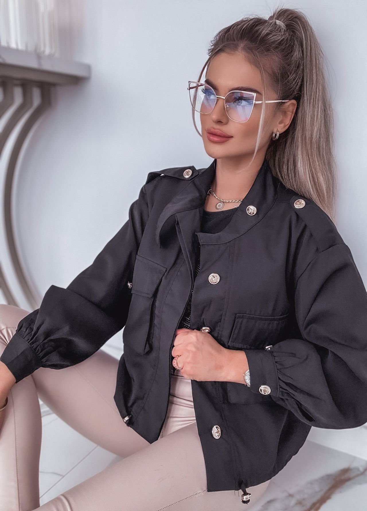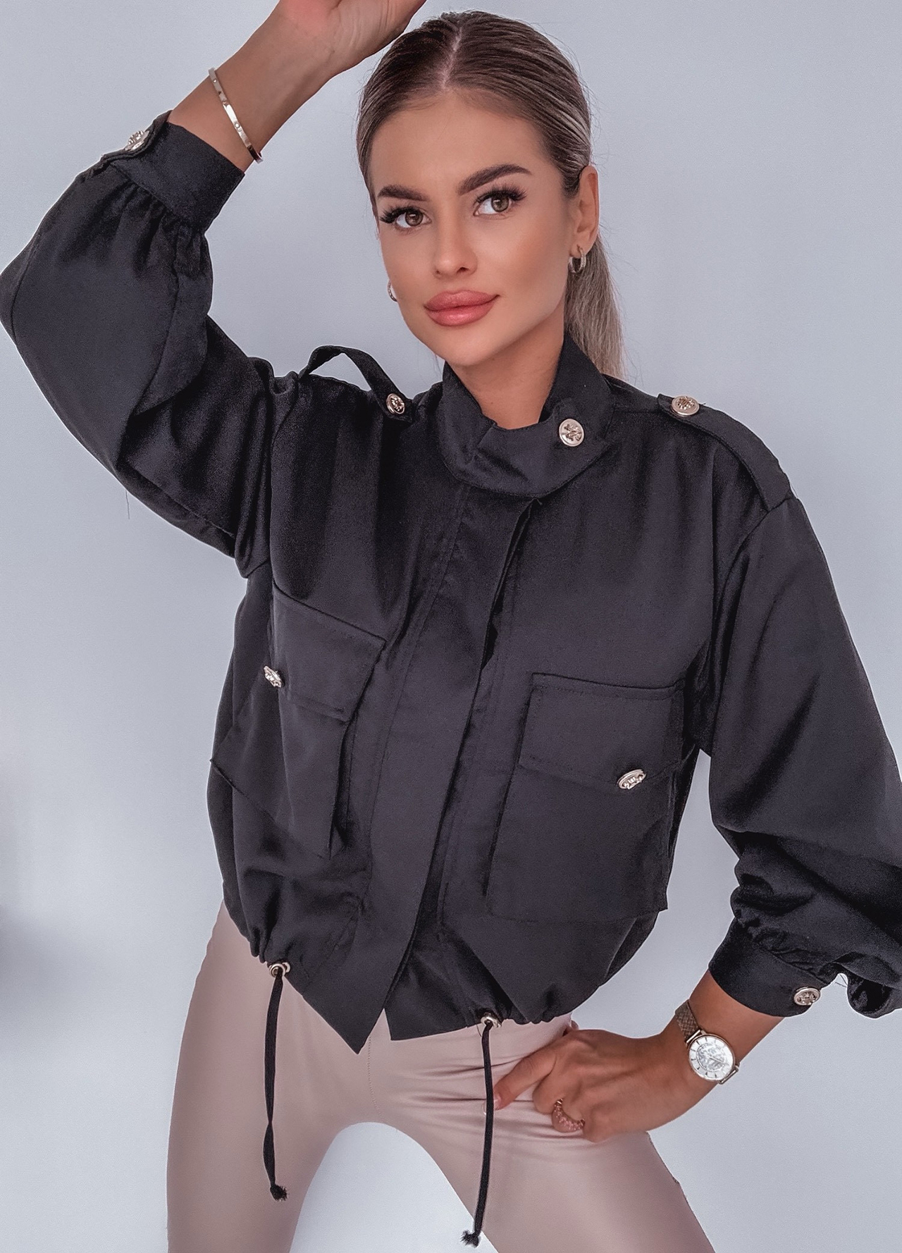 *Wzór: Kurtka / narzutka ze ściągaczem zdobiona złotymi guzikami.