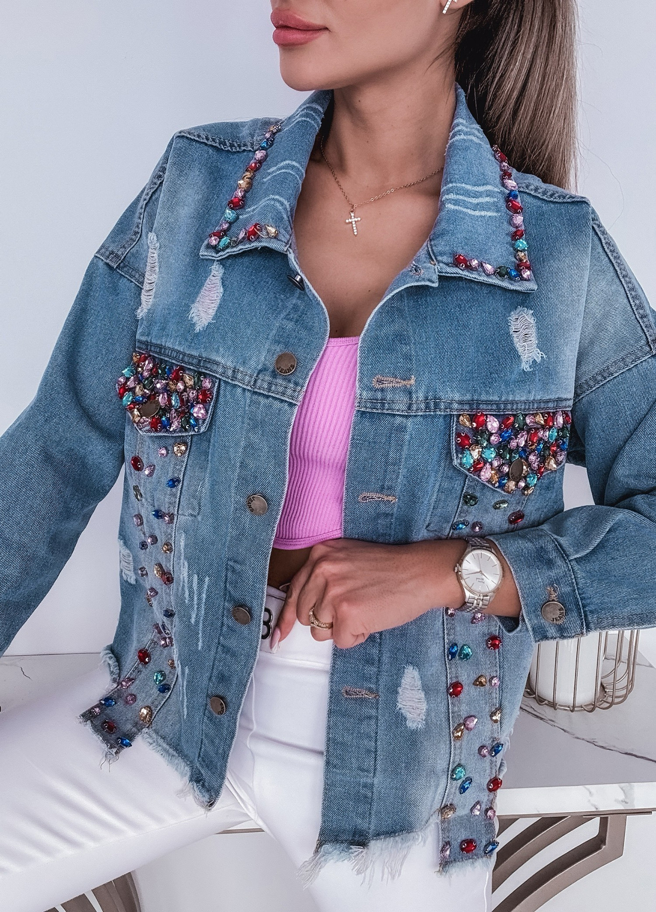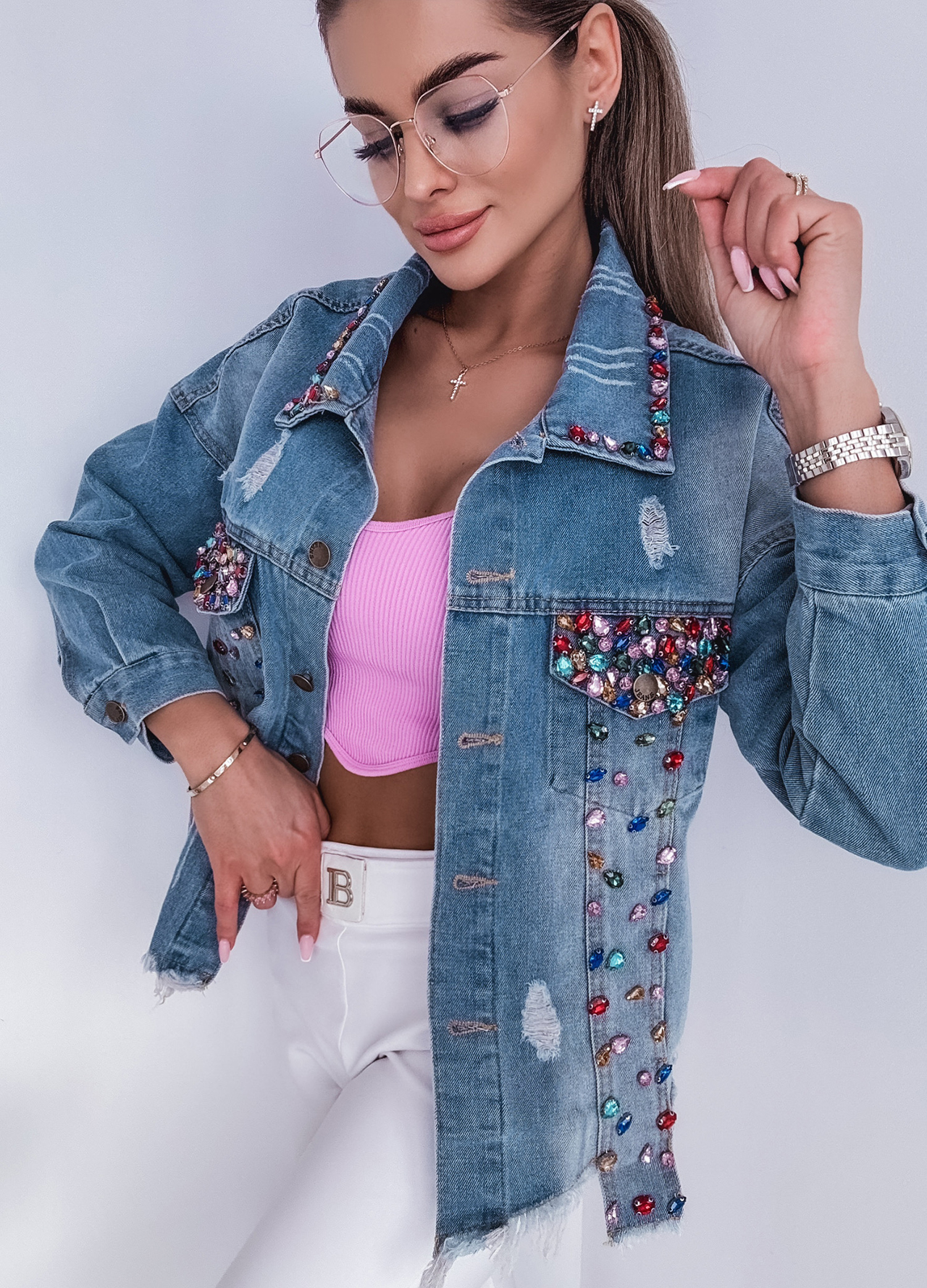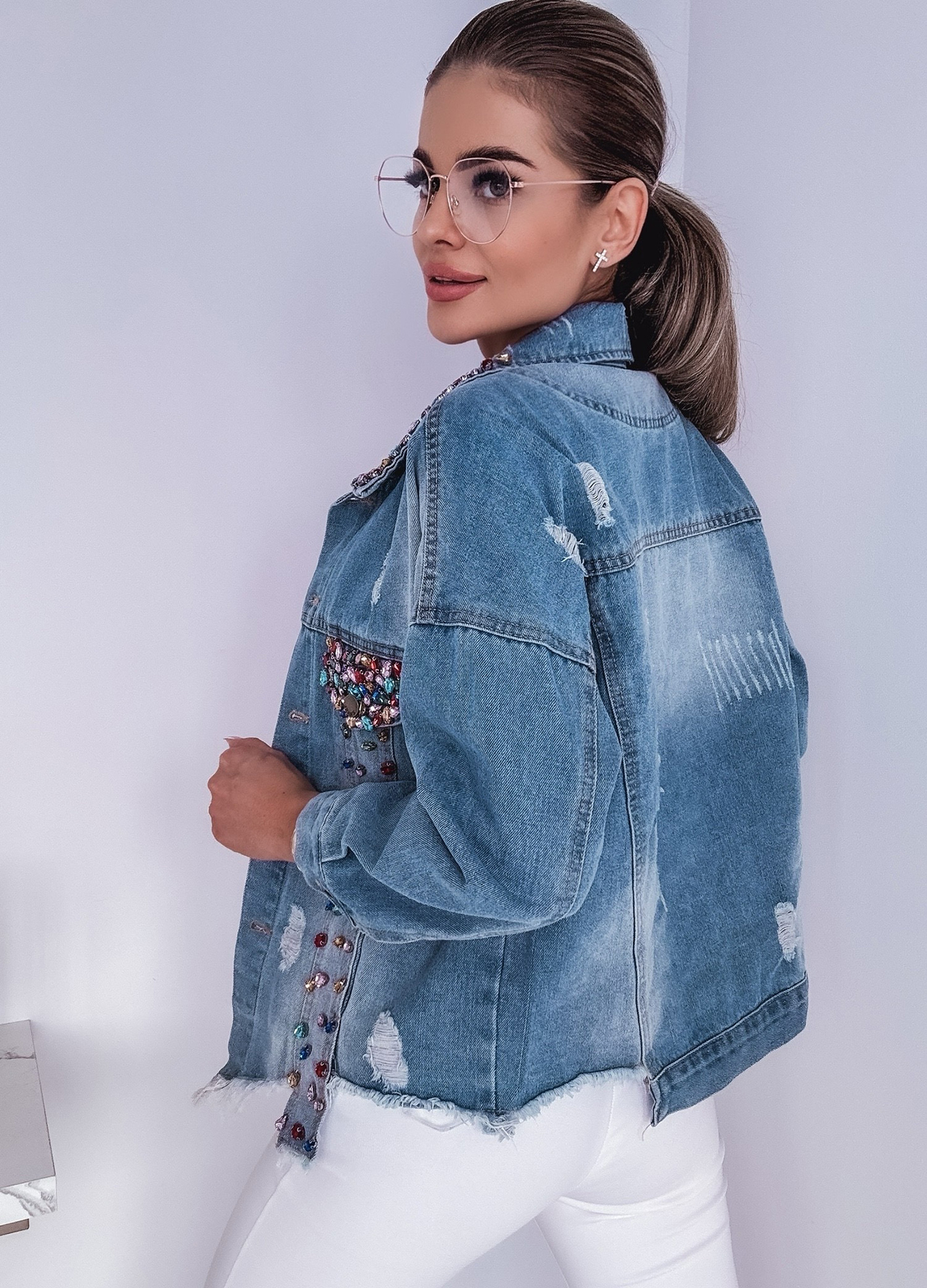 *Wzór: Kurtka jeansowa zdobiona cyrkoniami.