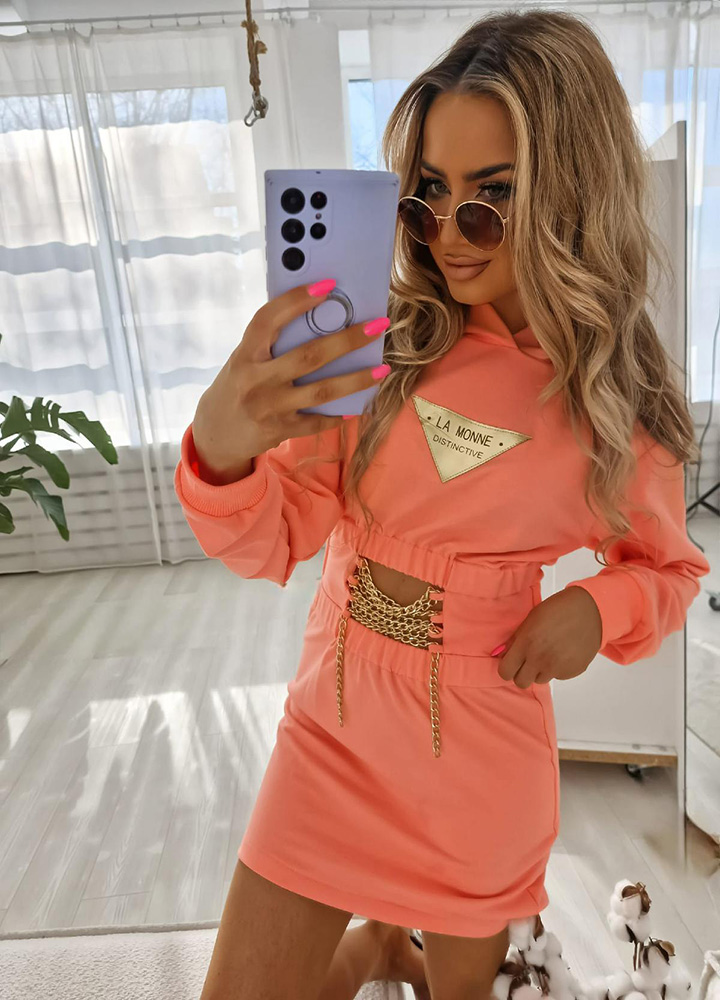 *Wzór: PRODUKT POLSKI. Bawełniana sukienka z kapturem w kolorze neonowym. Zdobiona złotymi łańcuchami i logiem LA MONNE.