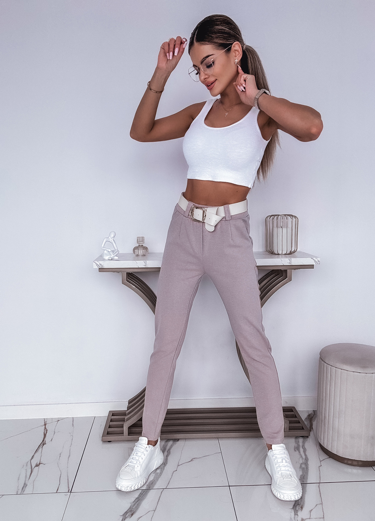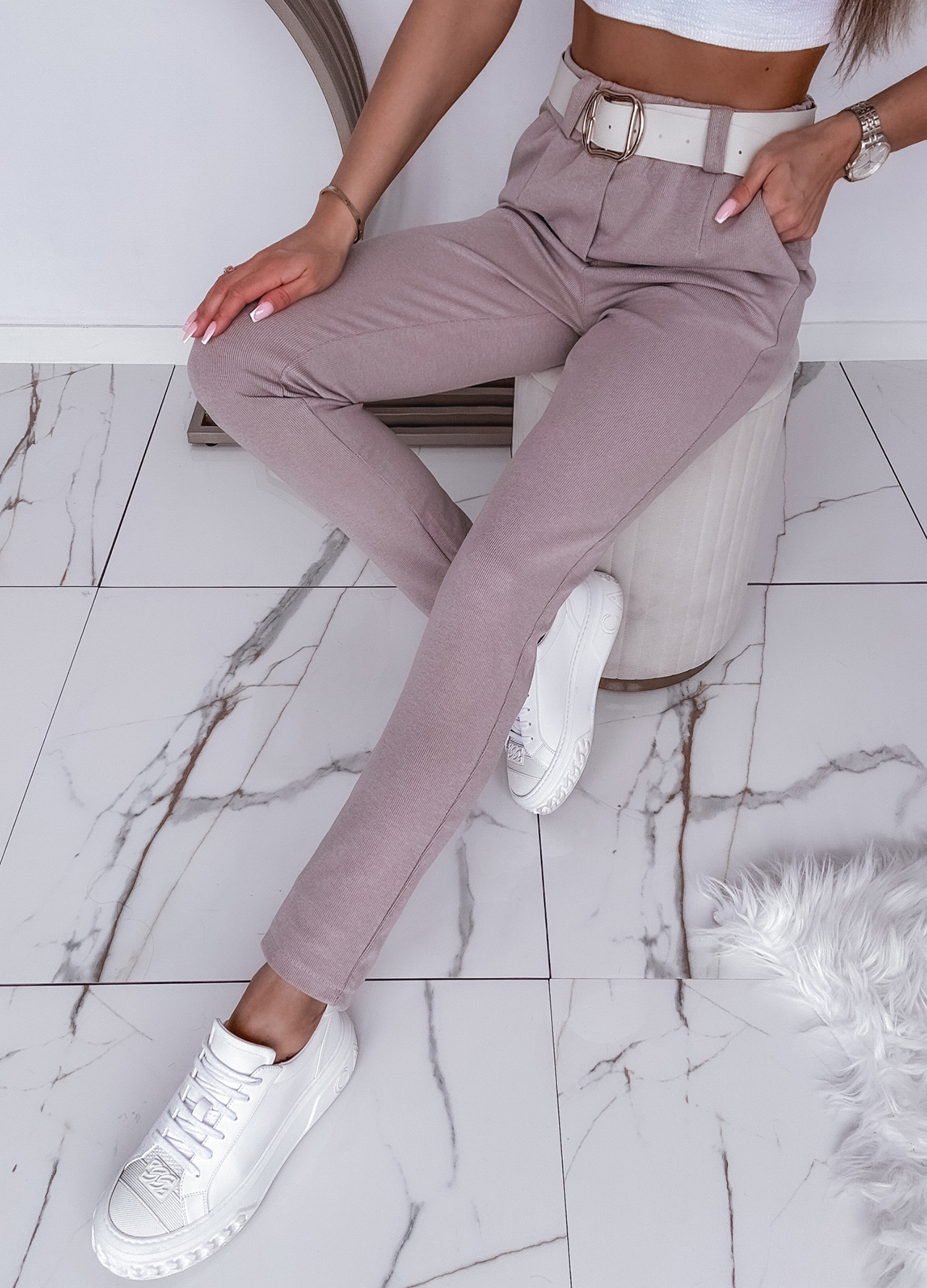 * Szczegóły: legginsy prążkowane z paskiem w zestawie.