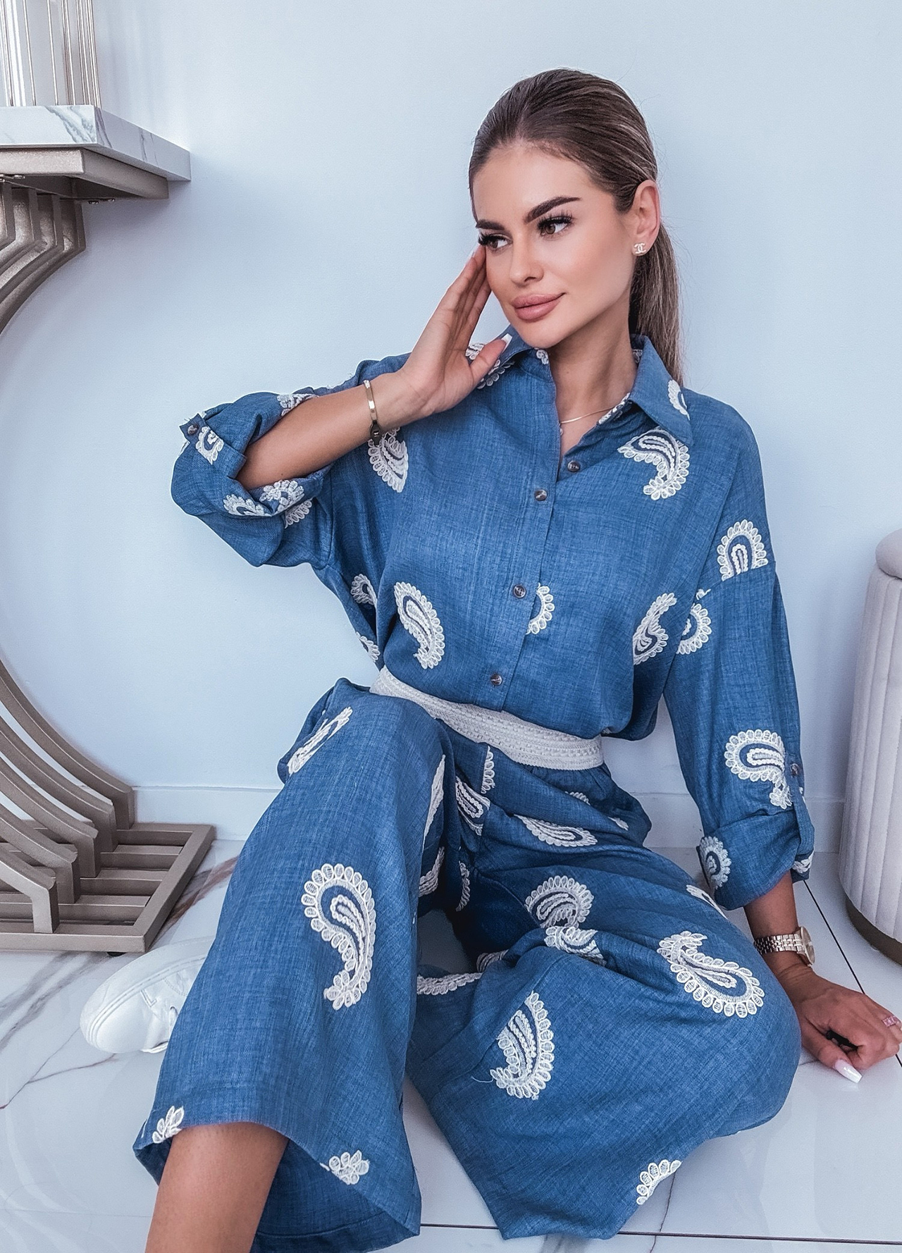 *Szczegóły: Elegancki komplet letni z haftem. Koszula + spodnie z szeroką nogawką.