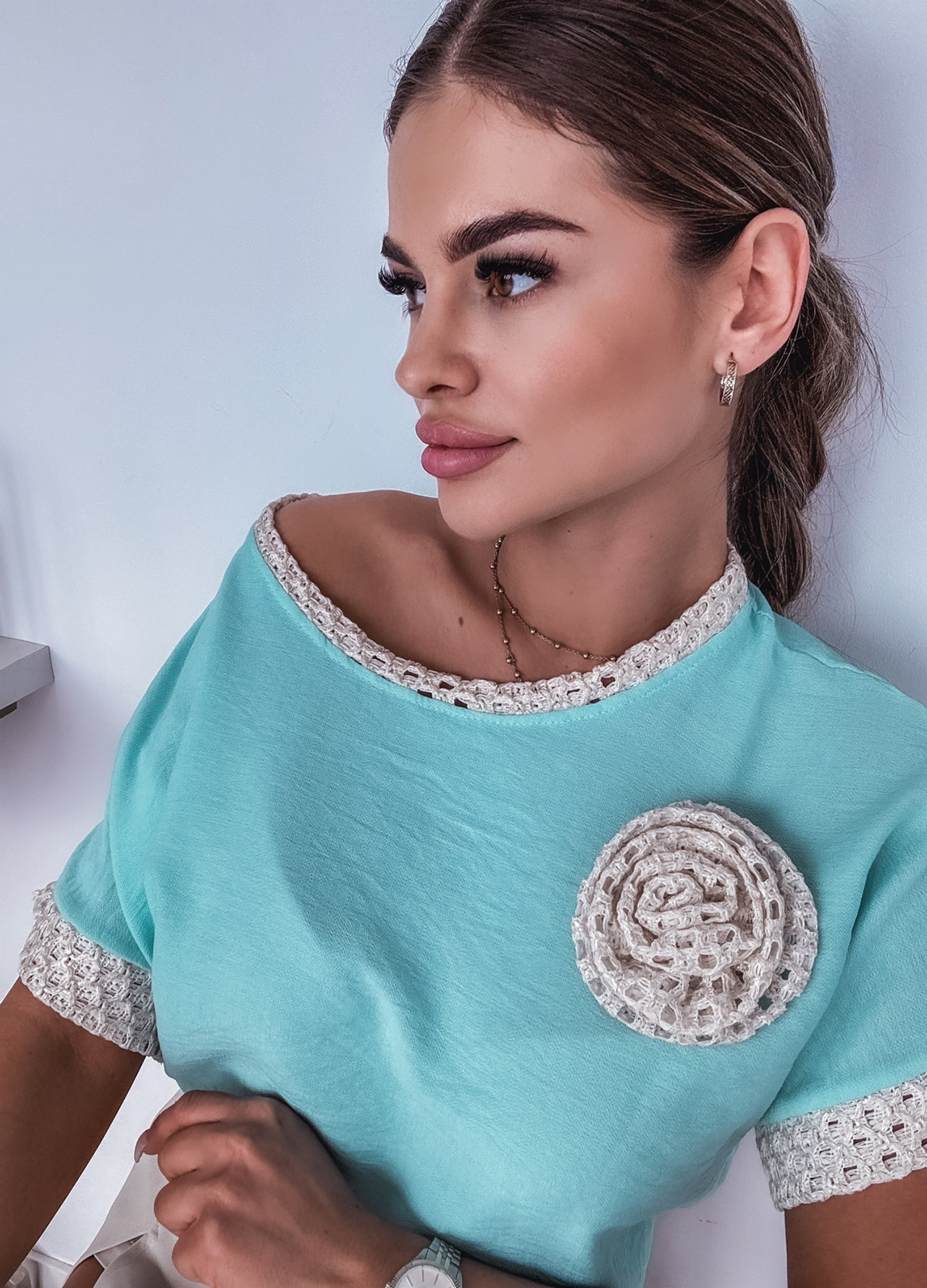 *Wzór: Bluzka w kolorze miętowym zdobiona ażurowymi aplikacjami.