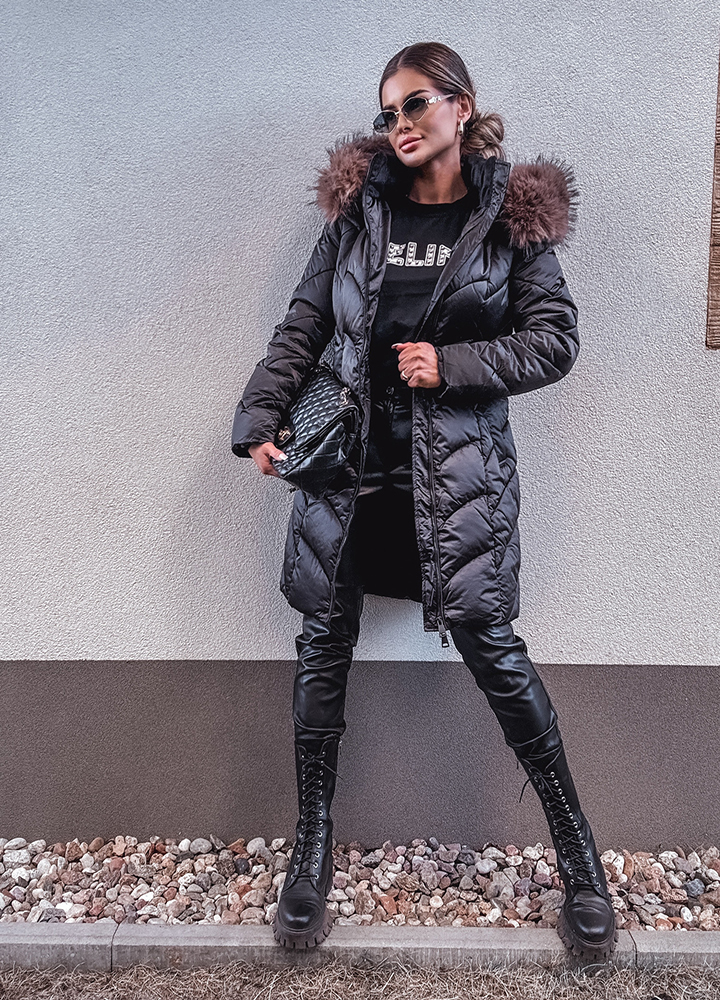 *Wzór: płaszcz pikowany efektownie z kapturem ozdobionym futerkiem