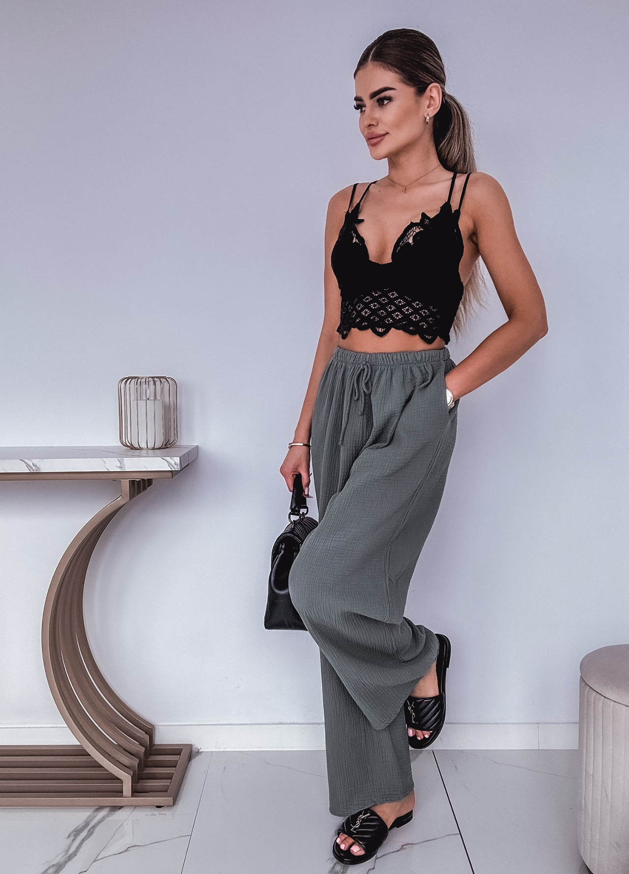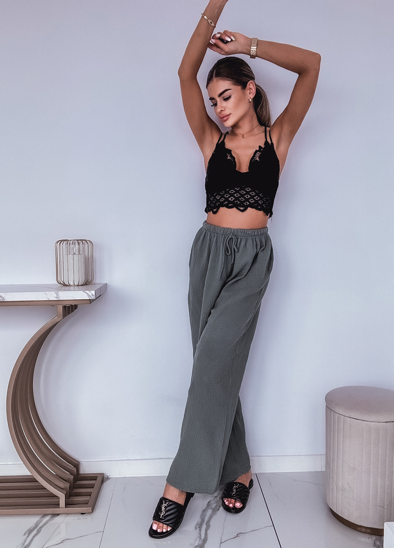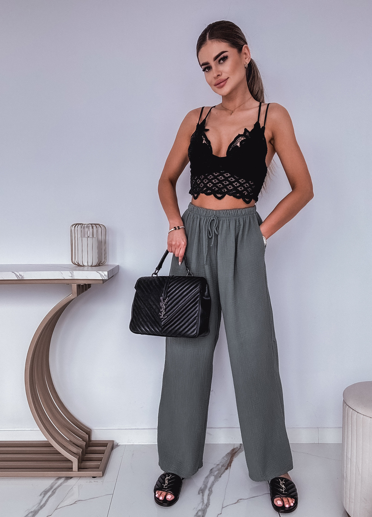 * Szczegóły: Spodnie z szeroką nogawką w kolorze khaki.