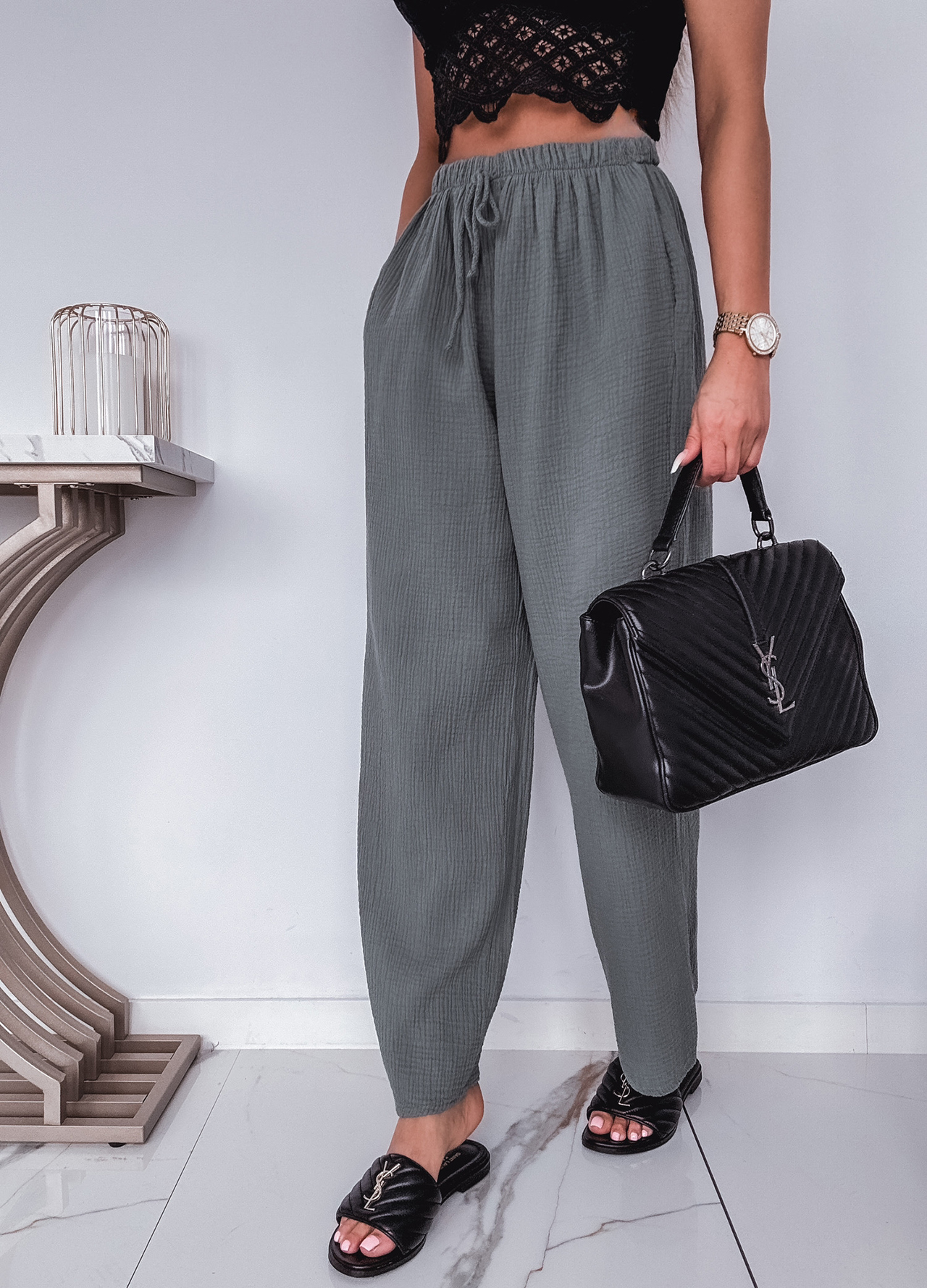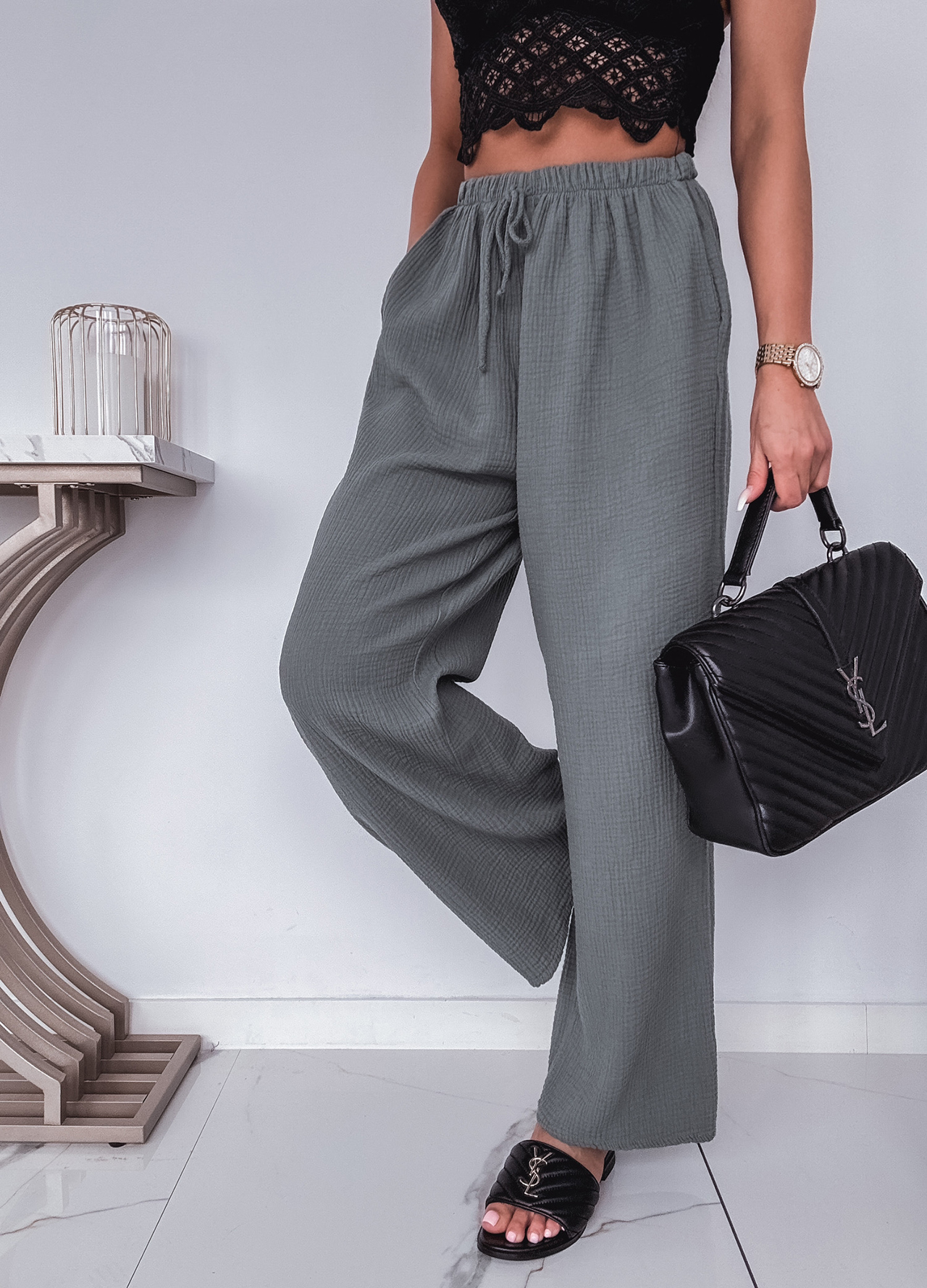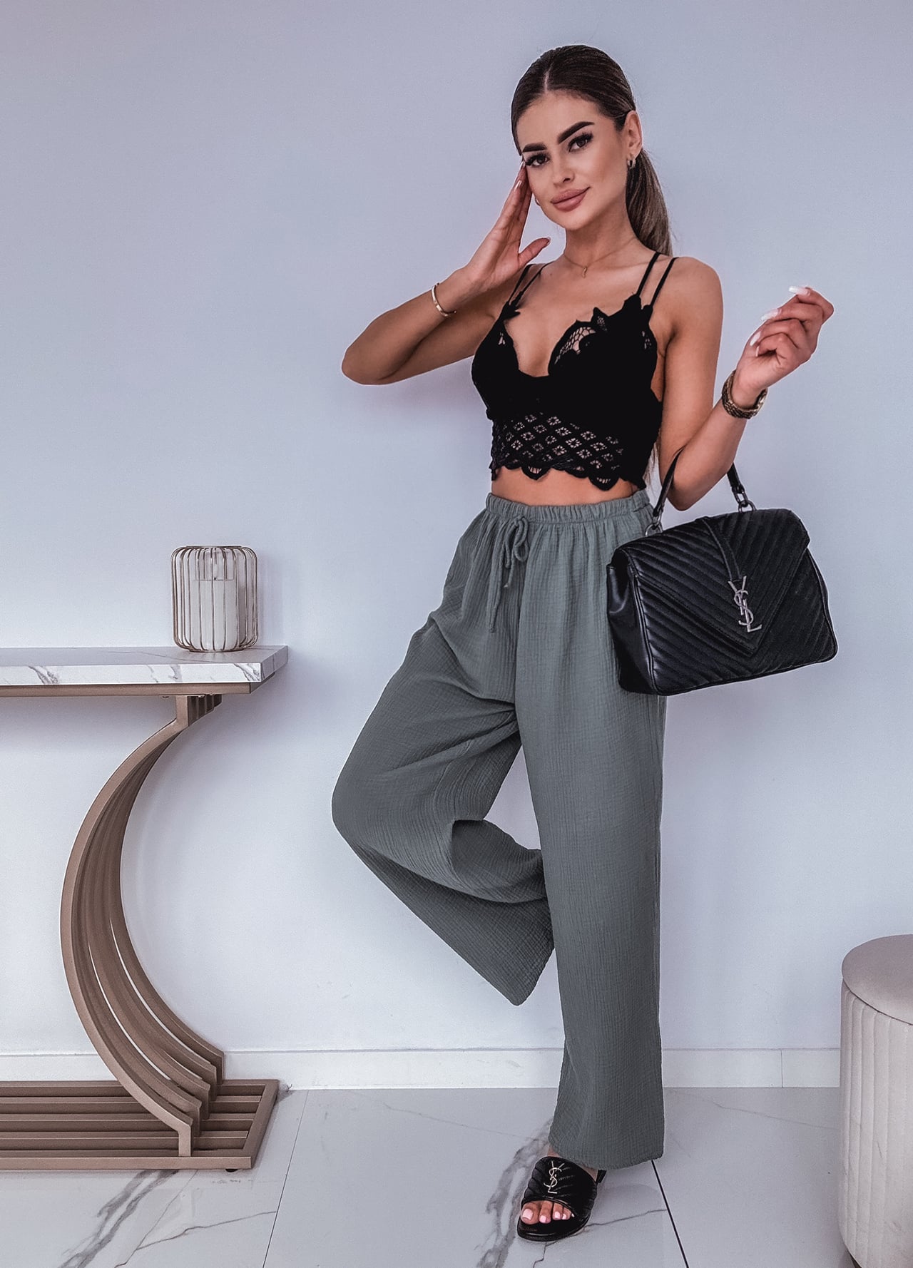 * Szczegóły: Spodnie z szeroką nogawką w kolorze khaki.
