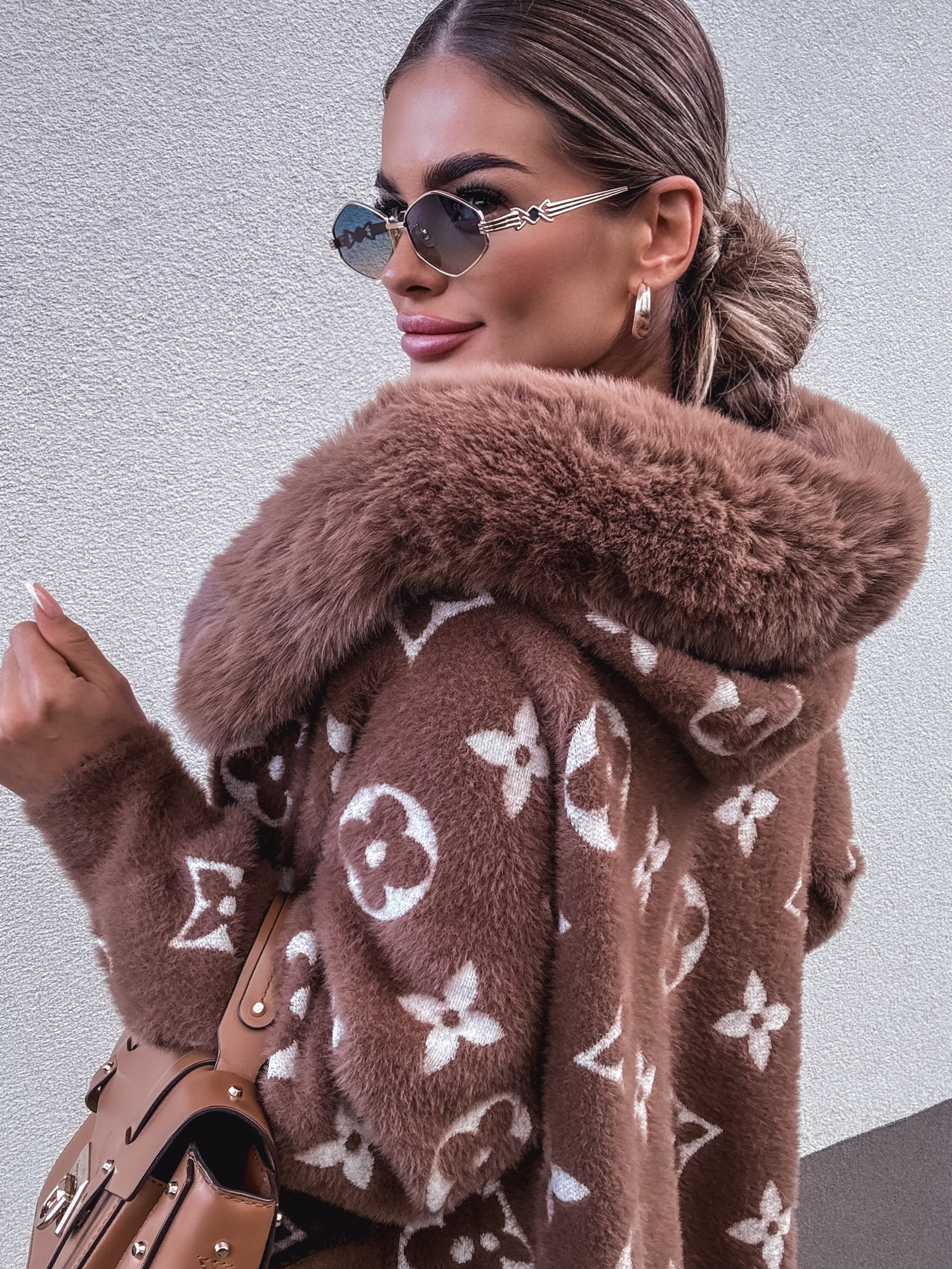 *Wzór: Płaszcz z futerkiem na kołnierzu , alpaka uszyta z miękkiego materiału z dodatkiem wełny i angory, rozmiar one size