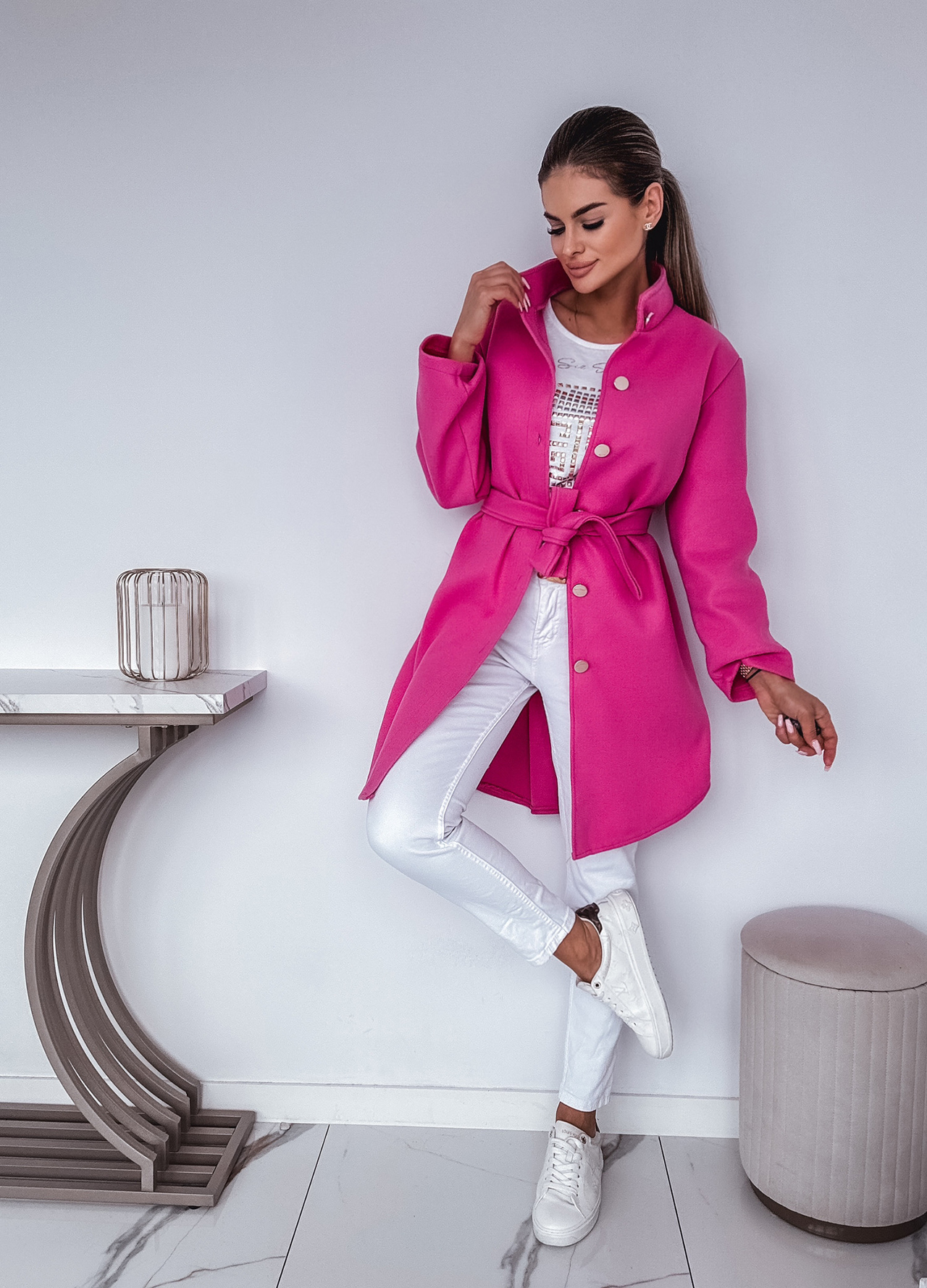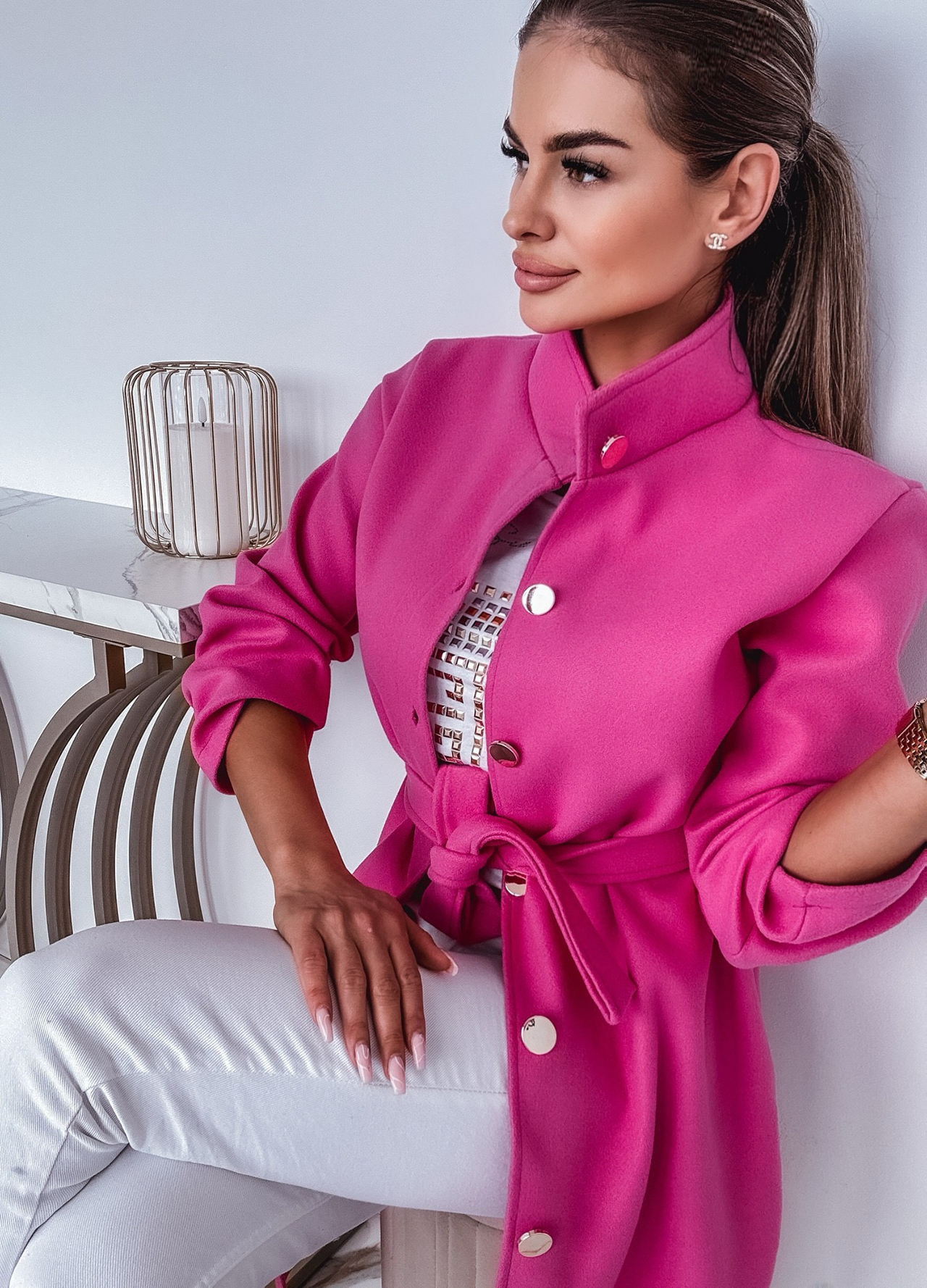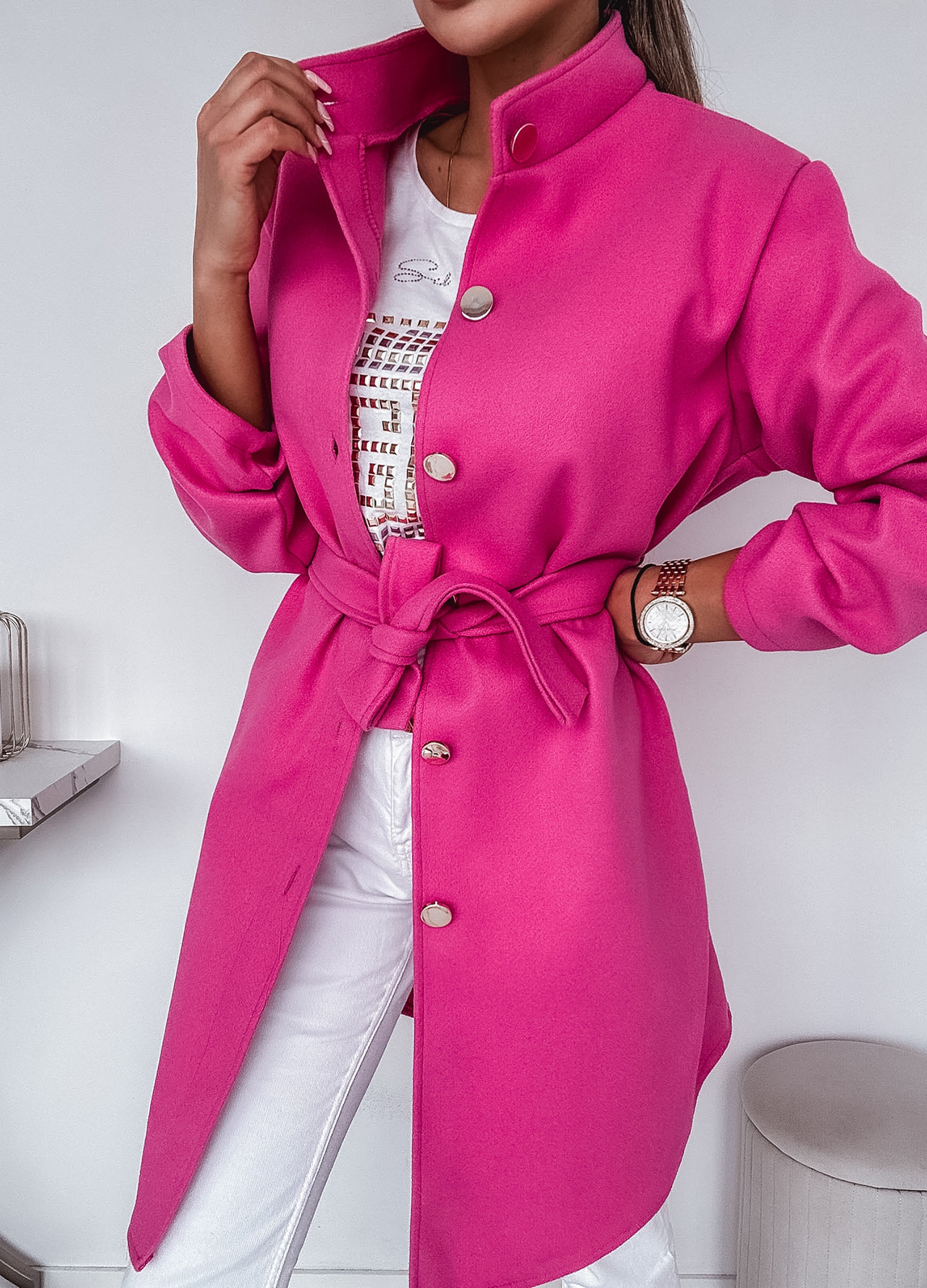 *Wzór: flauszowy płaszcz zapinany na guziki z wiązaniem w pasie.