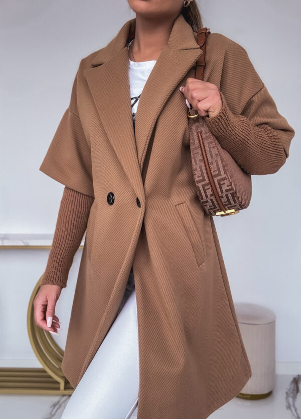 *Wzór: Przejściowy płaszcz z materiałowym rękawem. Posiada podszewkę w cętki.