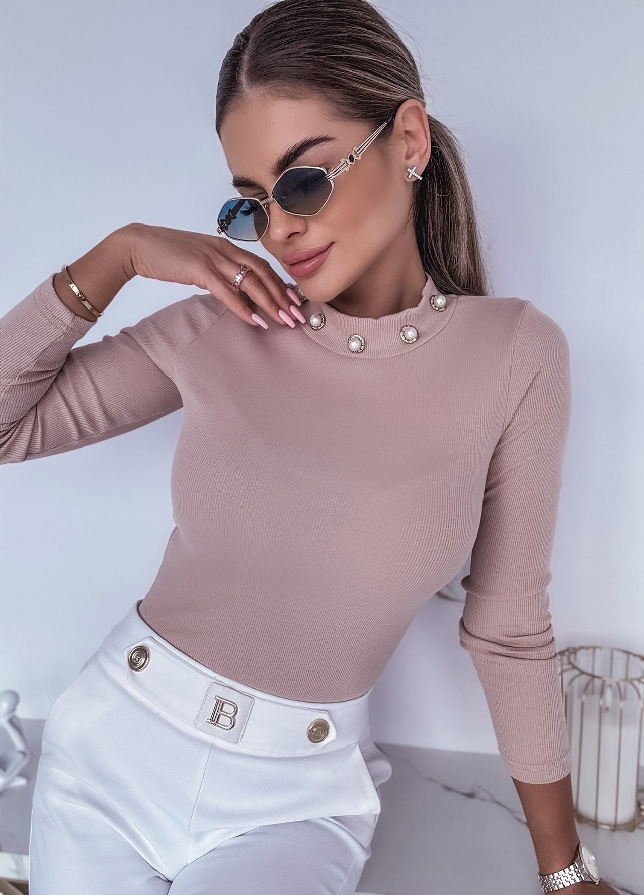 *Wzór: Bawełniana bluzka prążkowana z perłami przy dekolcie.