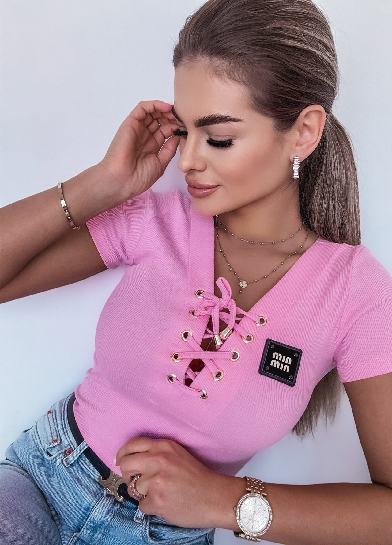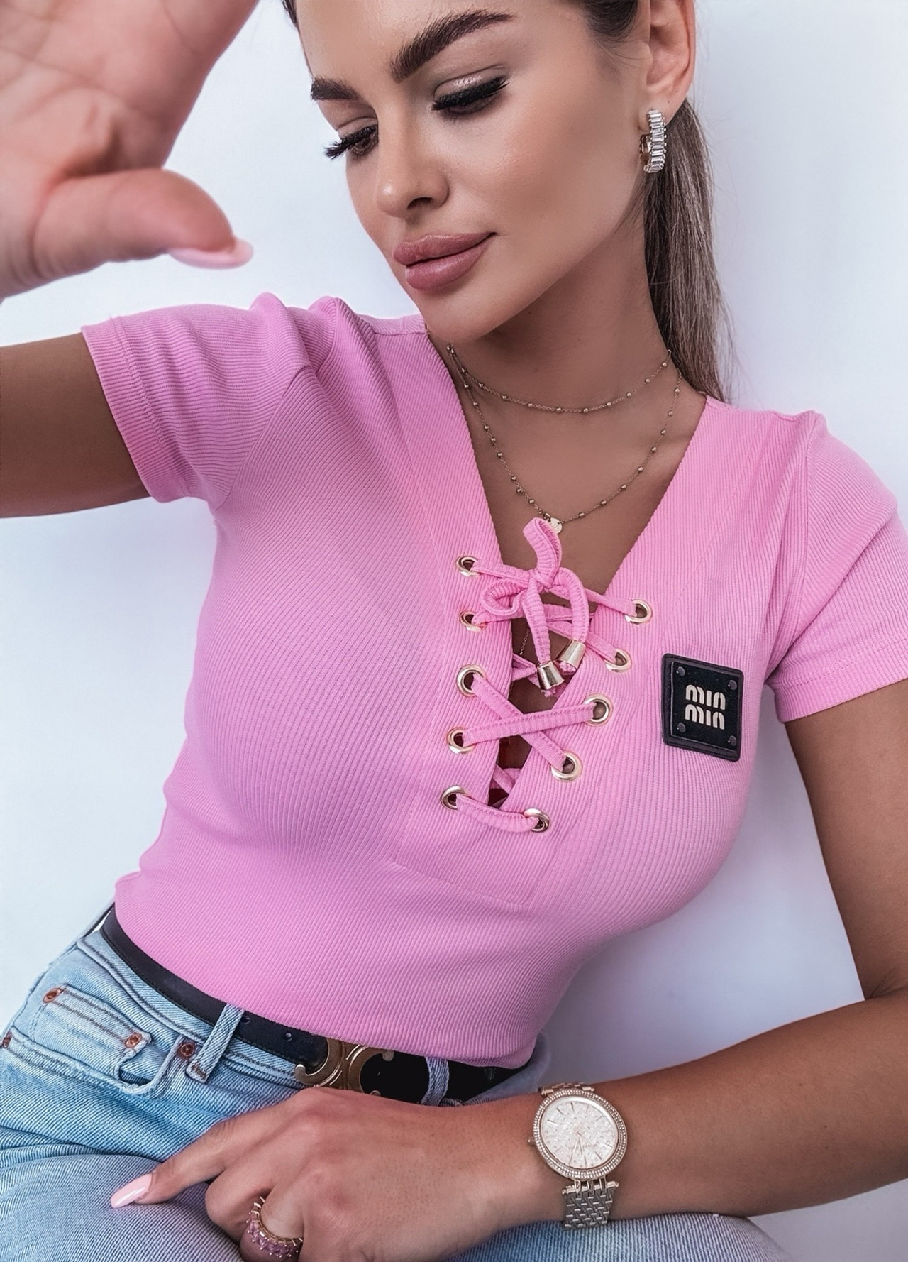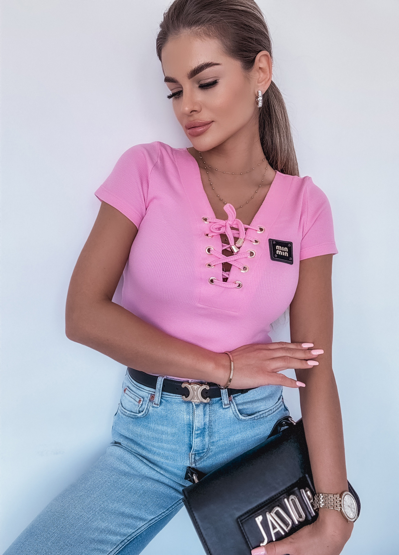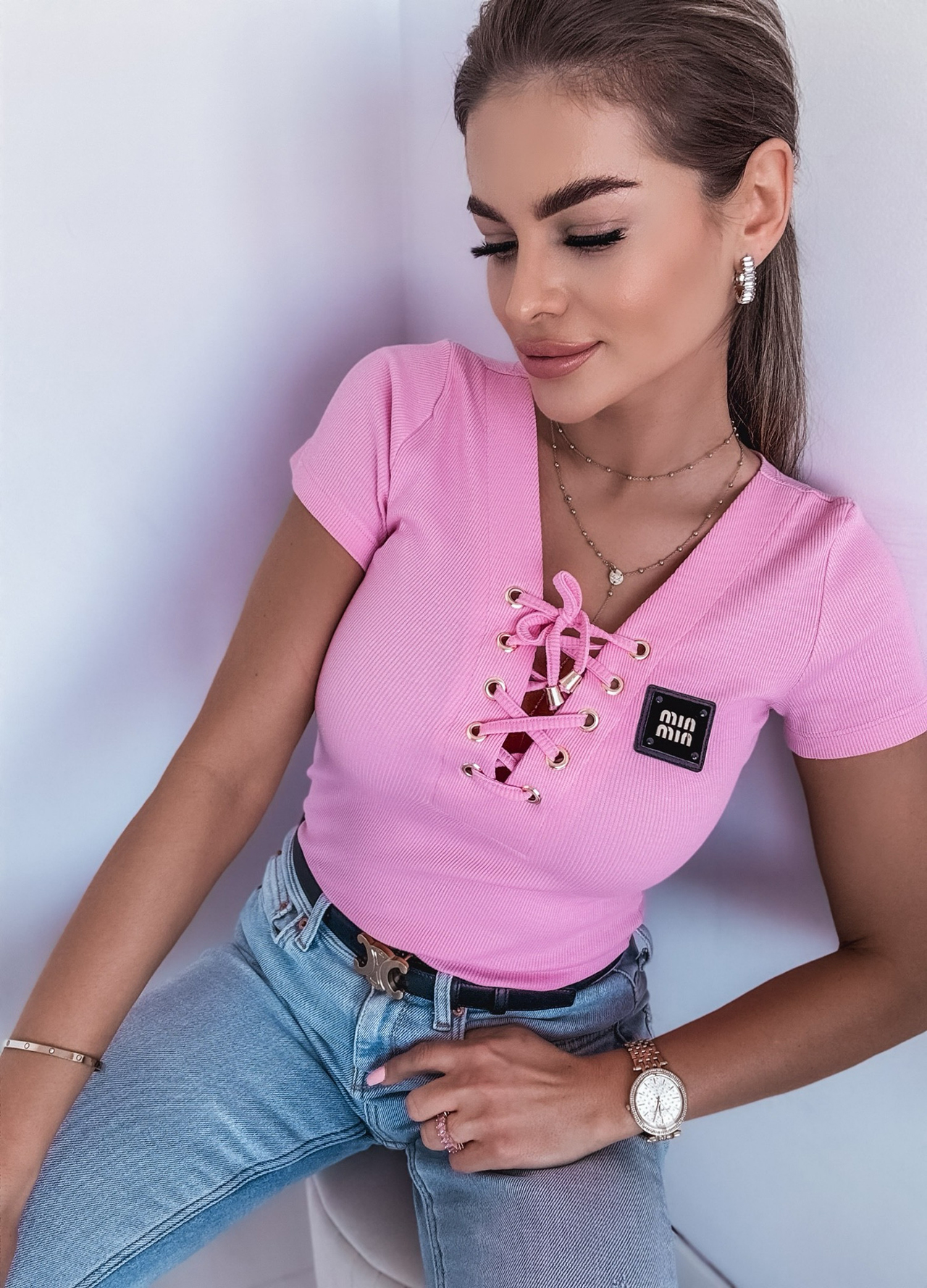 *Wzór: Bawełniany t-shirt prążkowany z wiązanym dekoltem.
