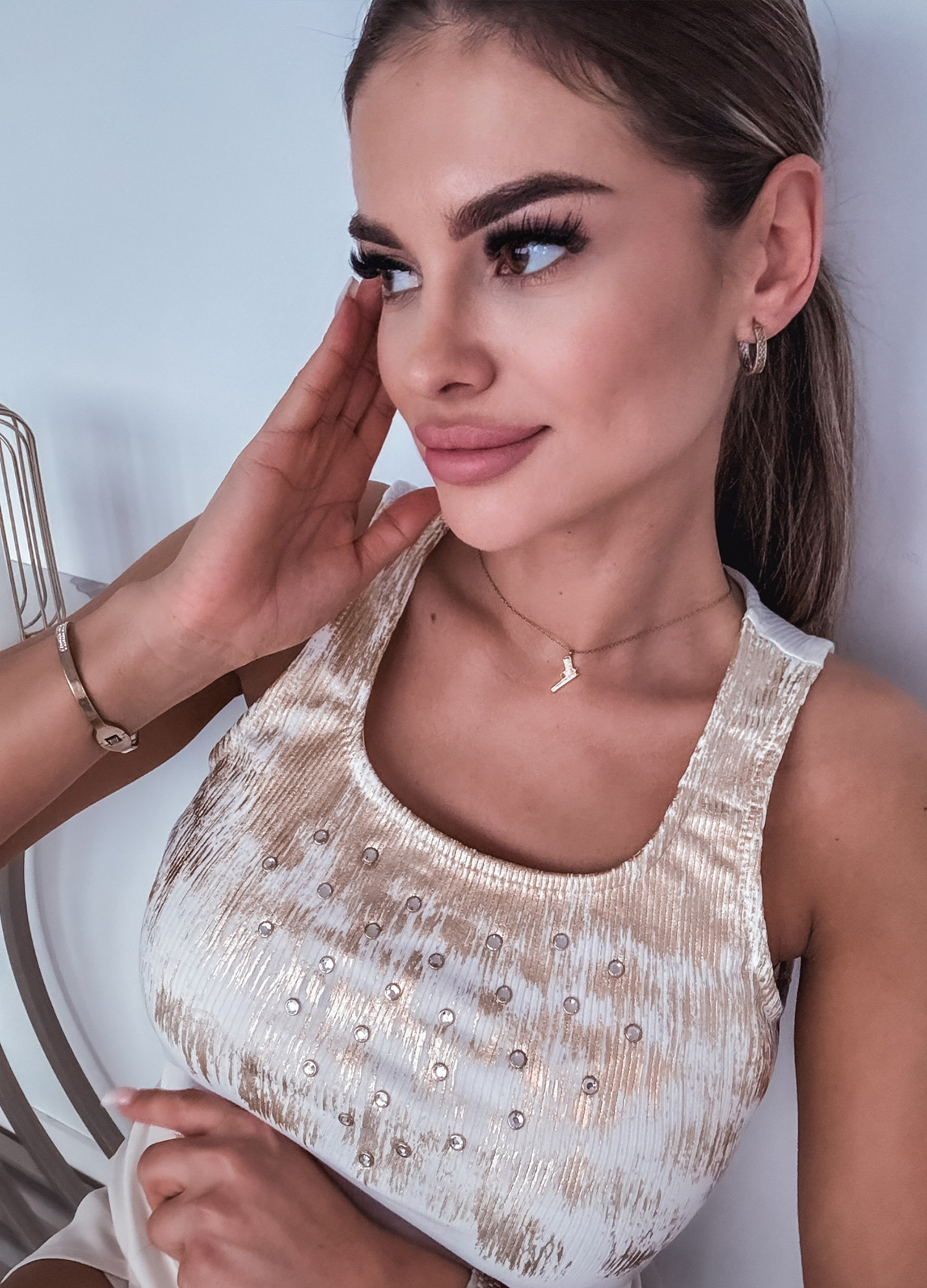 *Wzór: Bawełniany top prążkowany na ramiączkach zdobiony złotym nadrukiem i cyrkoniami.