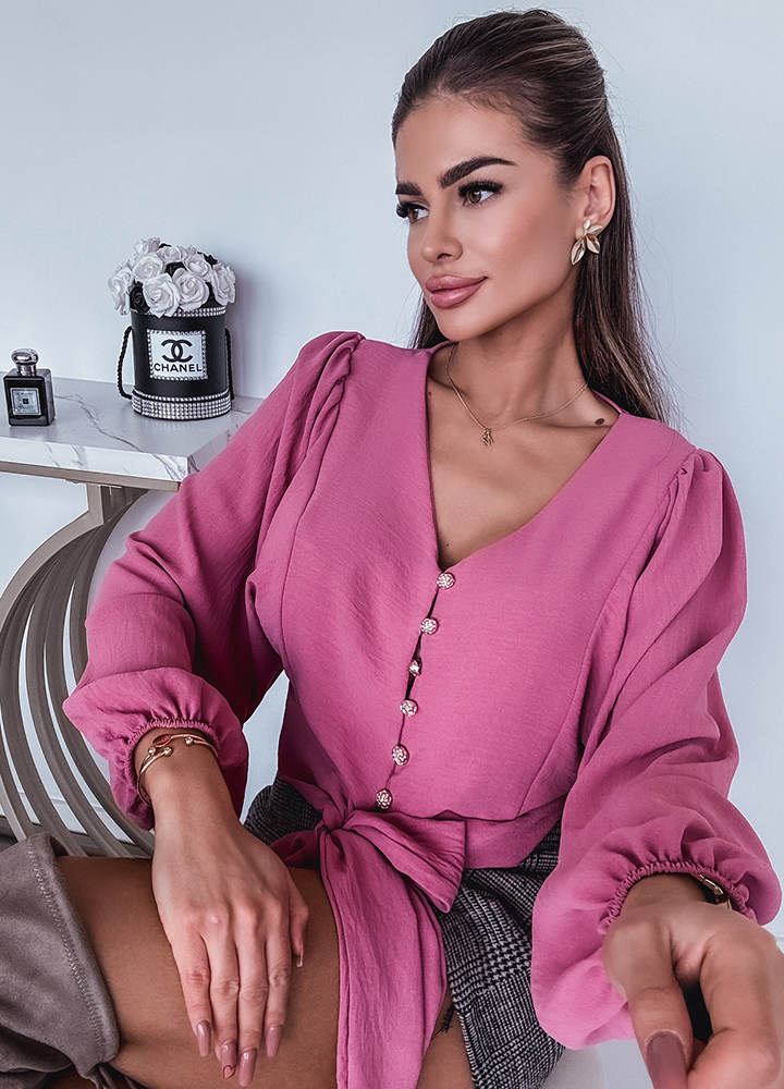 *Wzór: bluzka z wiązaniem, zapinana na guziki.