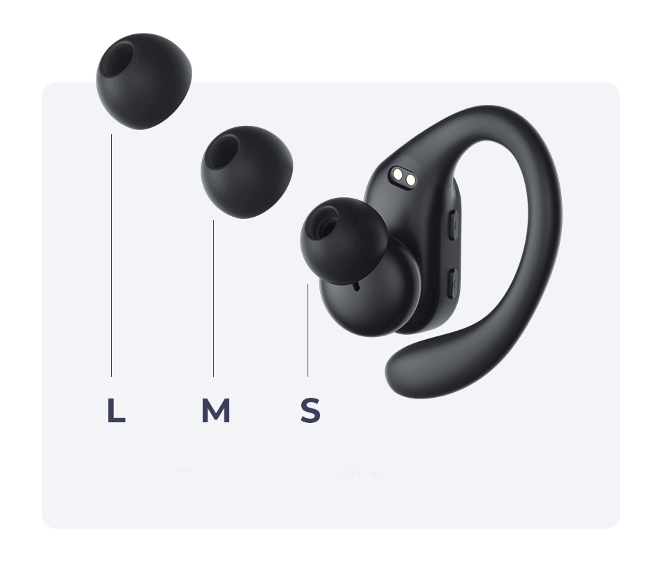 Słuchawki wyposażone w ergonomiczny zaczep na ucho, wymienne końcówki douszne (3 rozmiary) oraz haczyki z miękkiego silikonu – umożliwiające bezpieczne dopasowanie i komfort podczas intensywnych sesji treningowych oraz gamingu.
