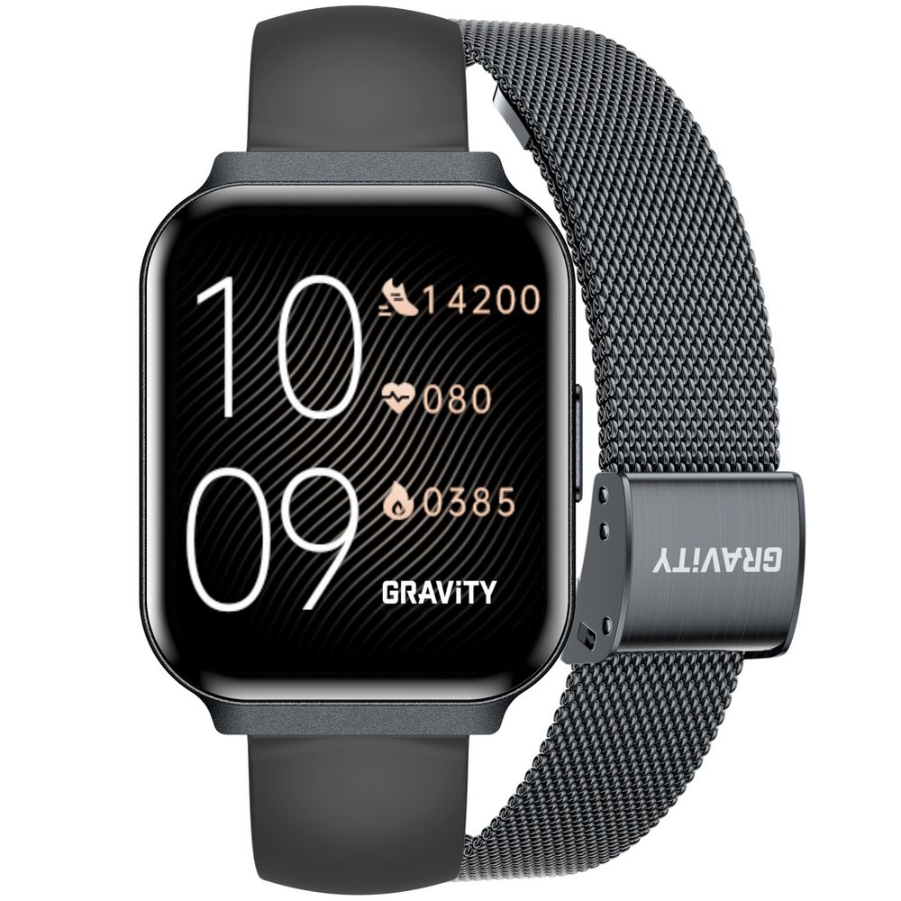 Smartwatch Gravity GT44-5 to idealne połączenie nowoczesnego stylu, eleganckiej prostoty i codziennej funkcjonalności. Ten stylowy smartwatch z prostokątną kopertą przyciąga uwagę wyrazistym, nowoczesnym designem i świetnie prezentuje się na nadgarstku. Grafitowa koperta nadaje mu mocnego, nowoczesnego charakteru, a w zestawie znajduje się ciemny pasek silikonowy oraz dodatkowa czarna bransoleta mesh, dzięki czemu z łatwością dopasujesz zegarek do pracy, codziennych stylizacji, aktywności i bardziej eleganckich okazji.