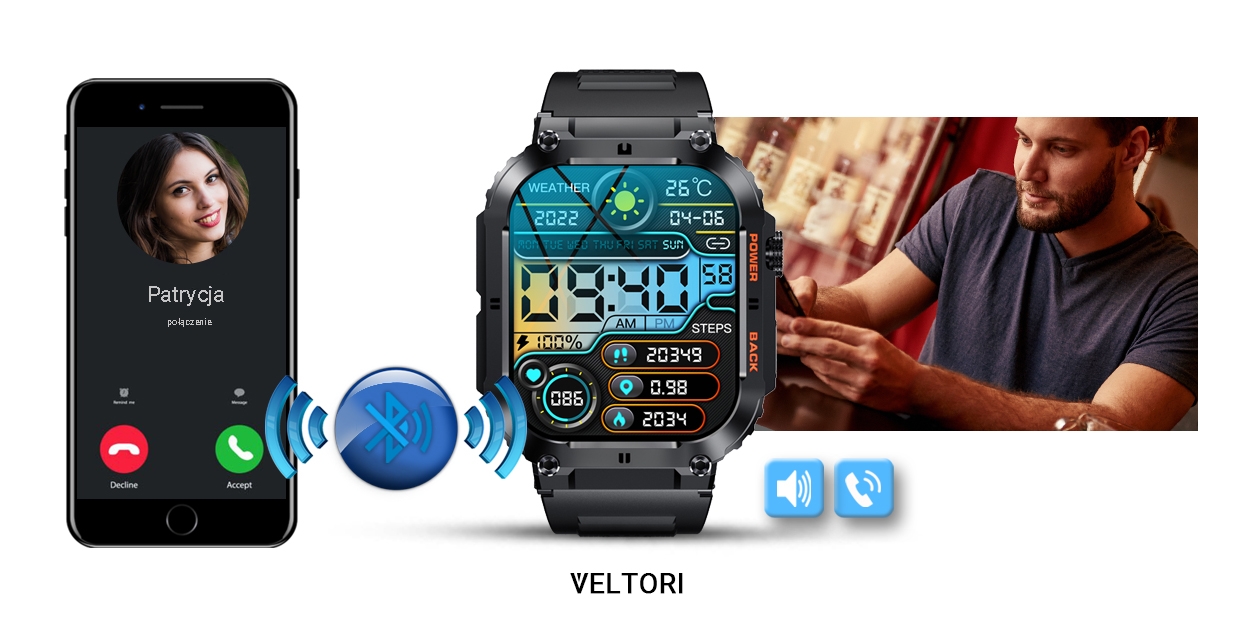 Ten smartwatch możesz połączyć ze swoim Smartfonem. Kompatybilność z systemem Android 4.4 i nowszy oraz iOS 8.0 i nowszy. Oznacza to, że smartwatch połączy się ze wszystkimi telefonami na systemie ANDROID i iOS.