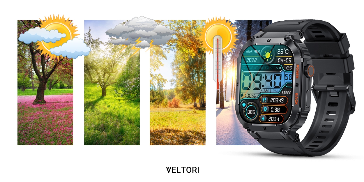Smartwatch po podłączeniu z aplikacją wyświetla dane o pogodzie. Teraz wystarczy jedno spojrzenia na smartwatcha i już wiesz jaka pogoda będzie Ci towarzyszyć w najbliższym czasie. Dzięki pogodzie w smartwatchu możesz lepiej zaplanować swoją aktywność i ubrać się odpowiednio do otaczającej aury!