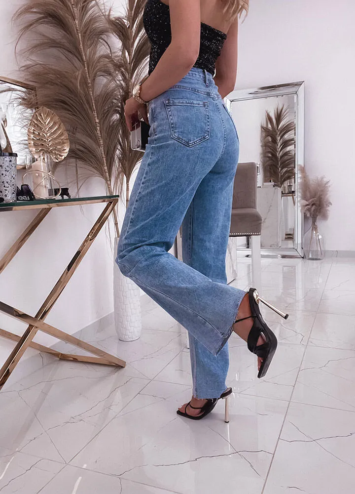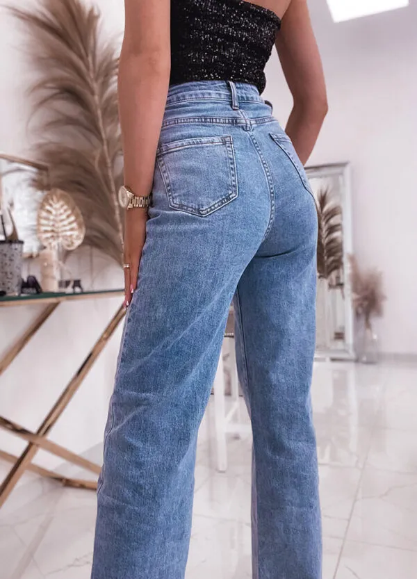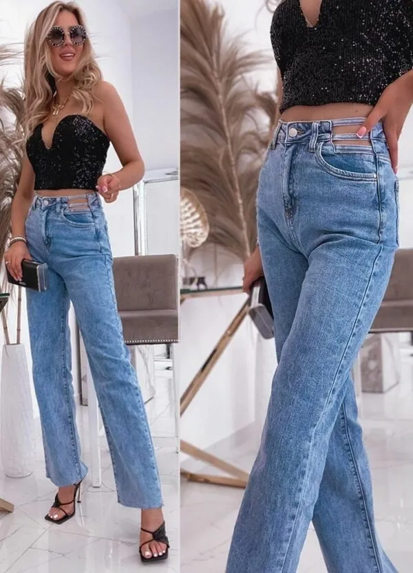 *Szczegóły: Spodnie jeansowe o prostym kroju z ozdobnymi wycięciami w pasie/ Kieszenie przednie i tylne.