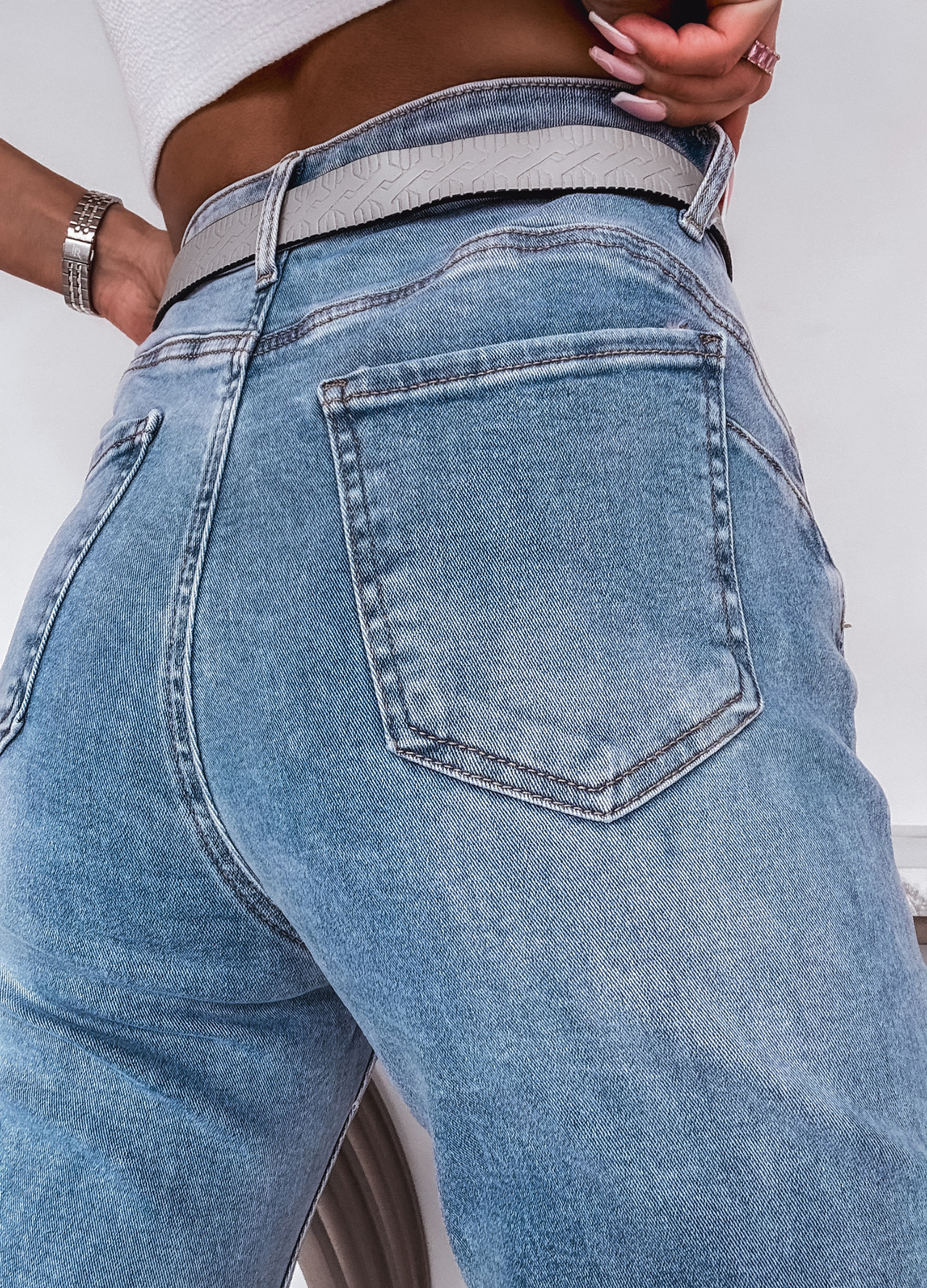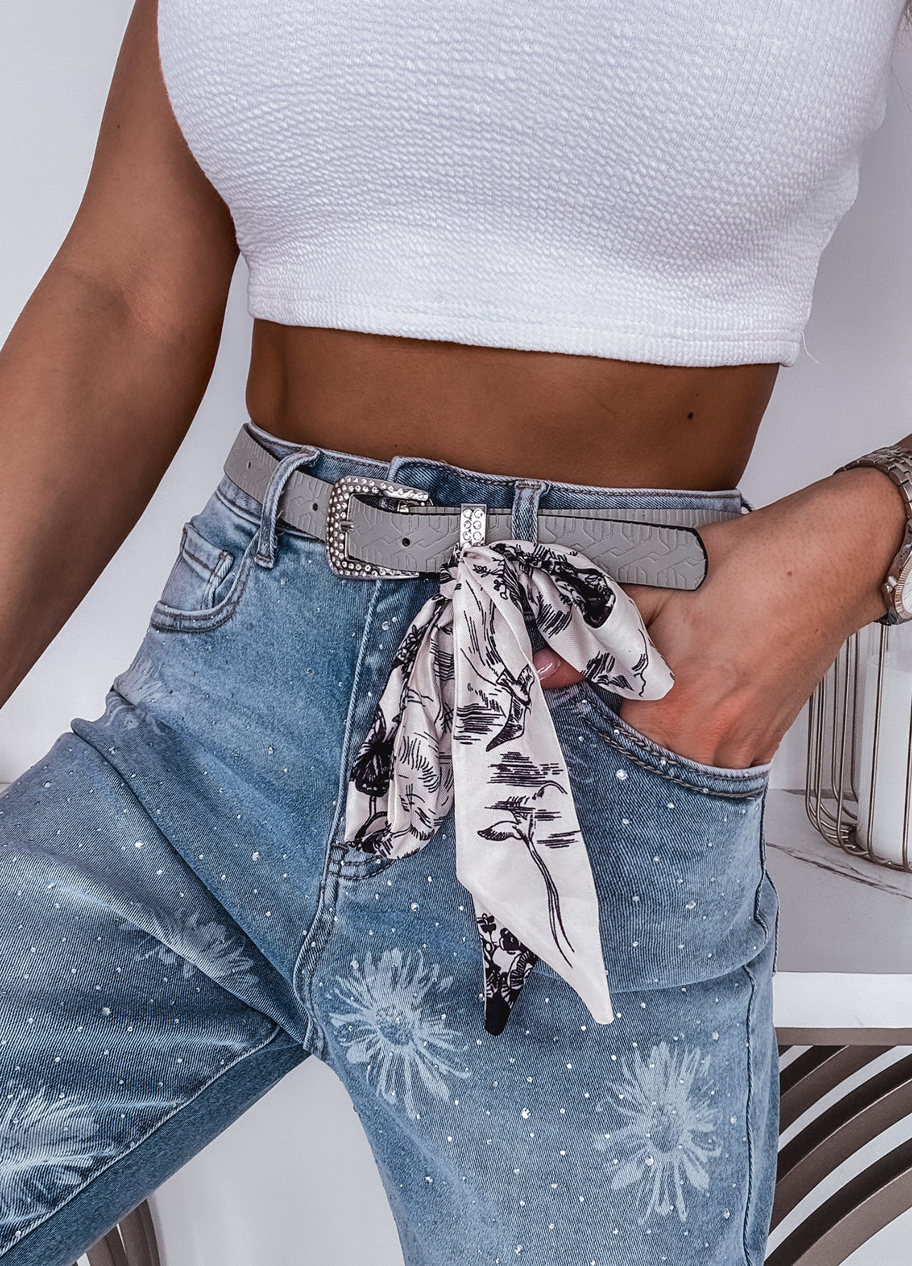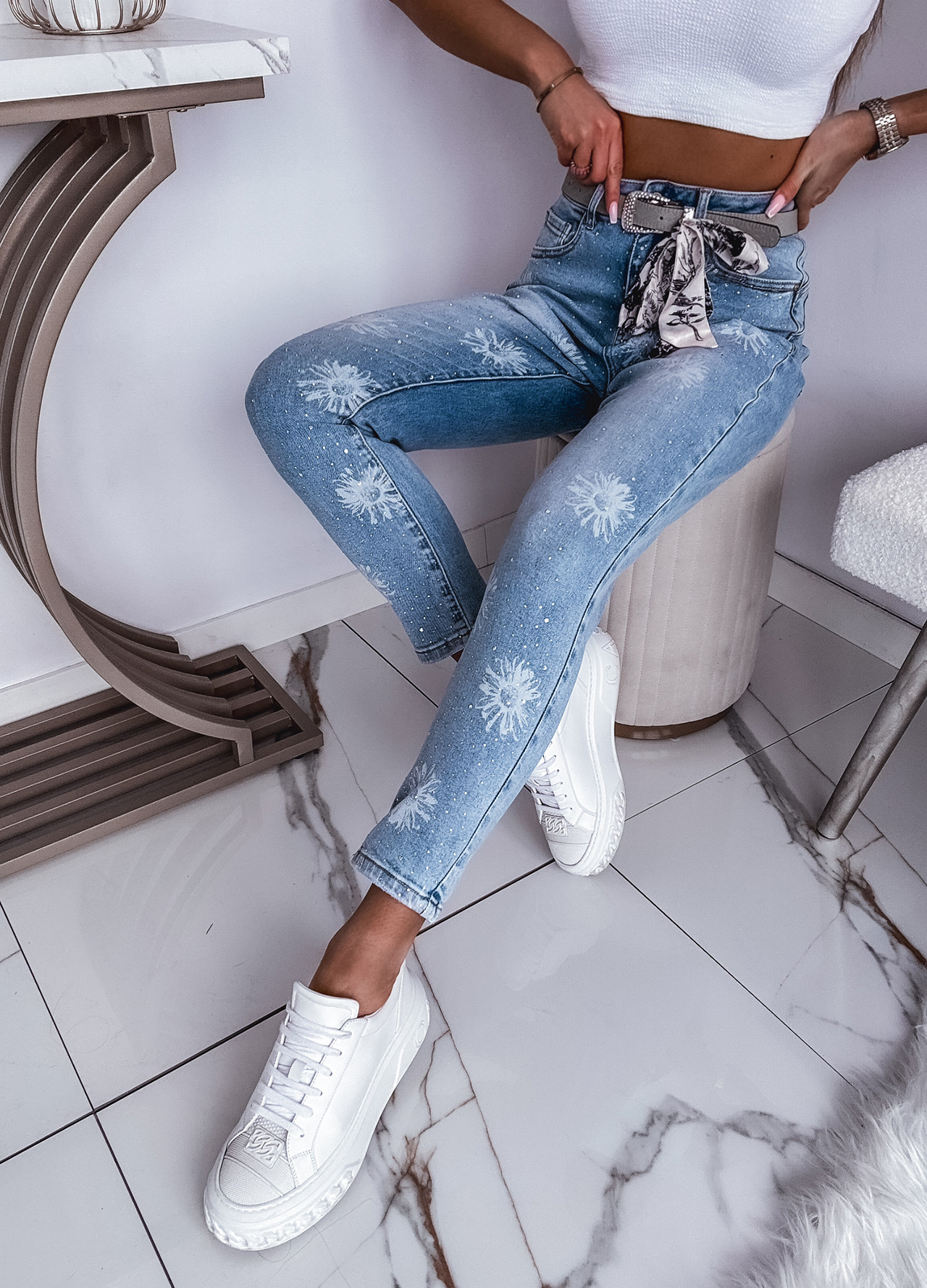 *Szczegóły: Spodnie jeansowe z paskiem zdobione cekinami.