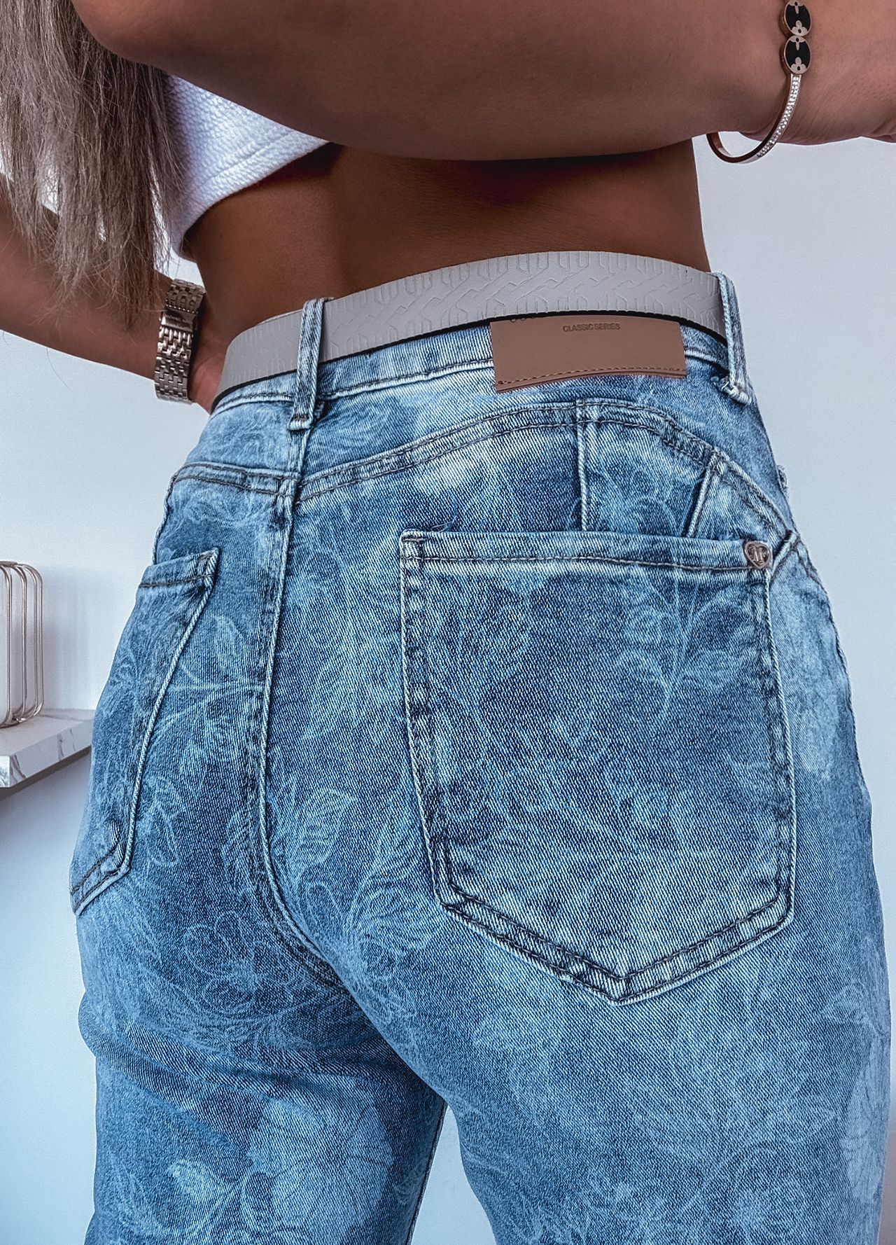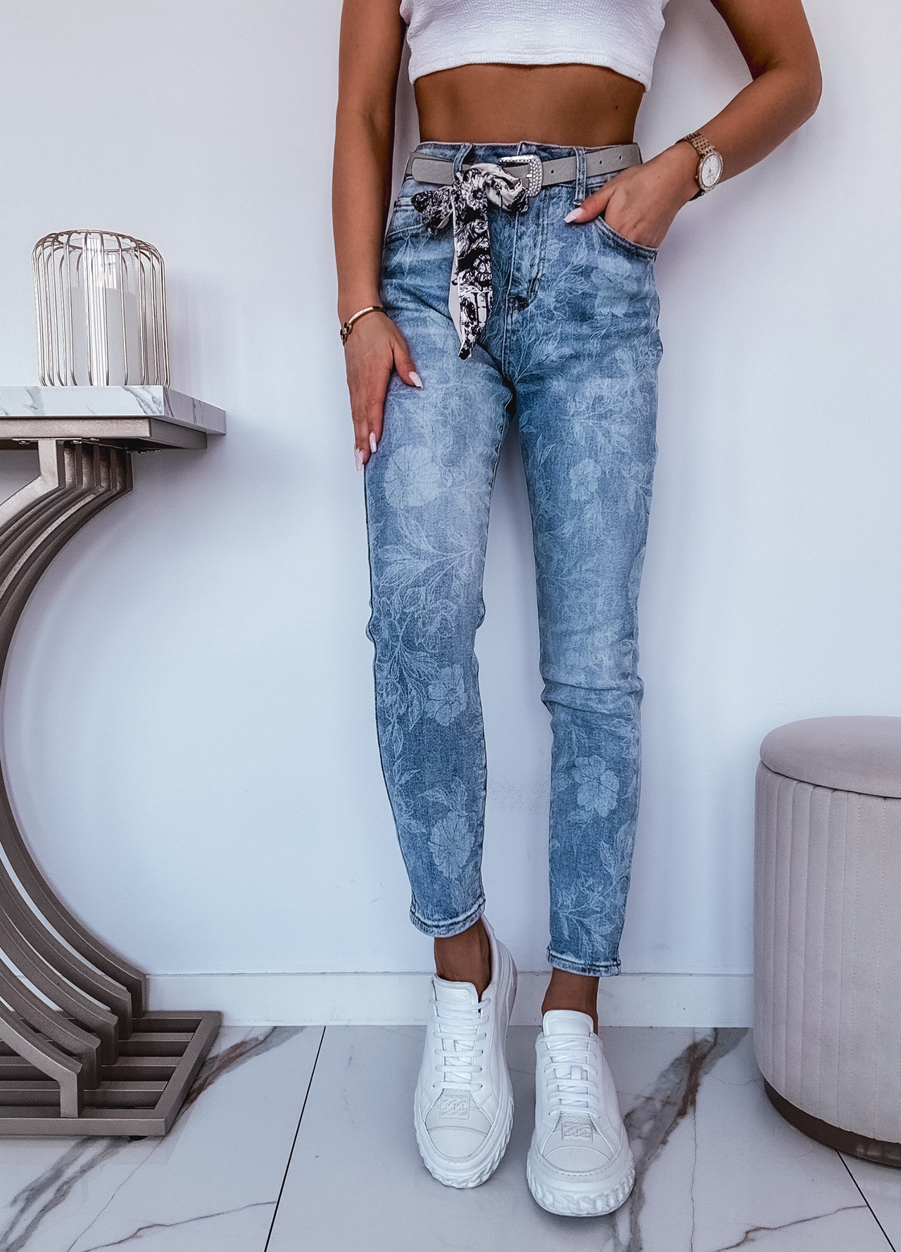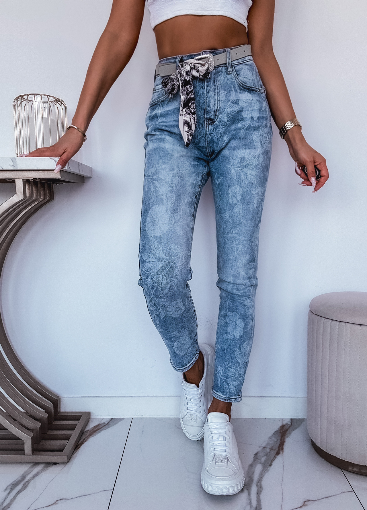 *Szczegóły: Spodnie jeansowe z paskiem zdobione cekinami.