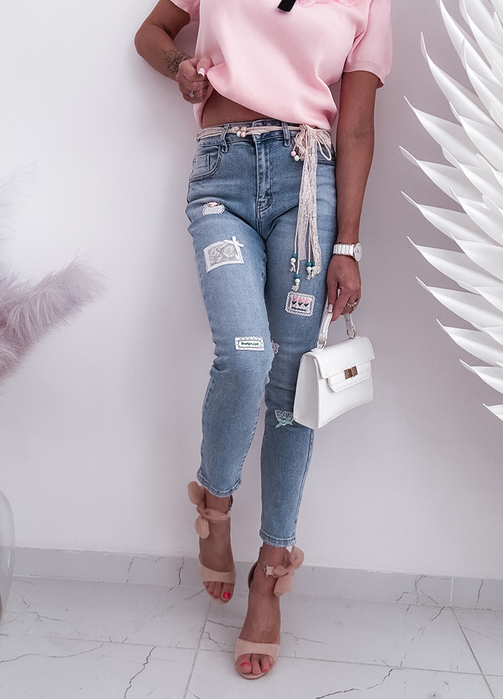 * Szczegóły: spodnie jeansowe zdobione naszywkami + pasek