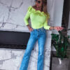 * Szczegóły: Spodnie jeansowe z wysokim stanem. Model – dzwony.