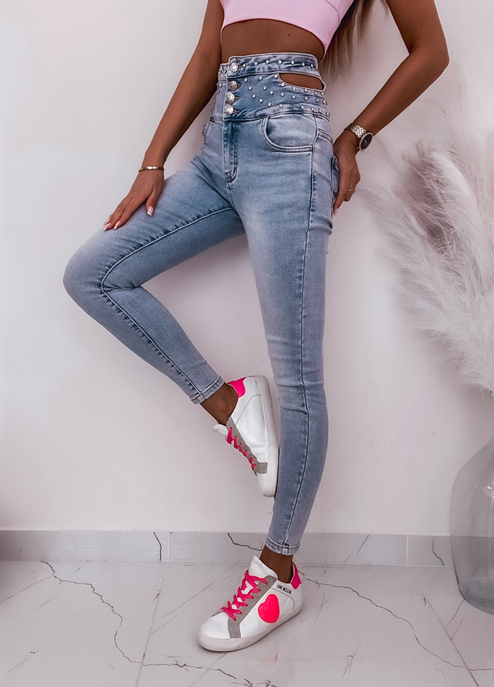 *Szczegóły: Spodnie jeansowe rurki zdobiona cekinami na wysokim pasie z ozdobymi wycięciami.