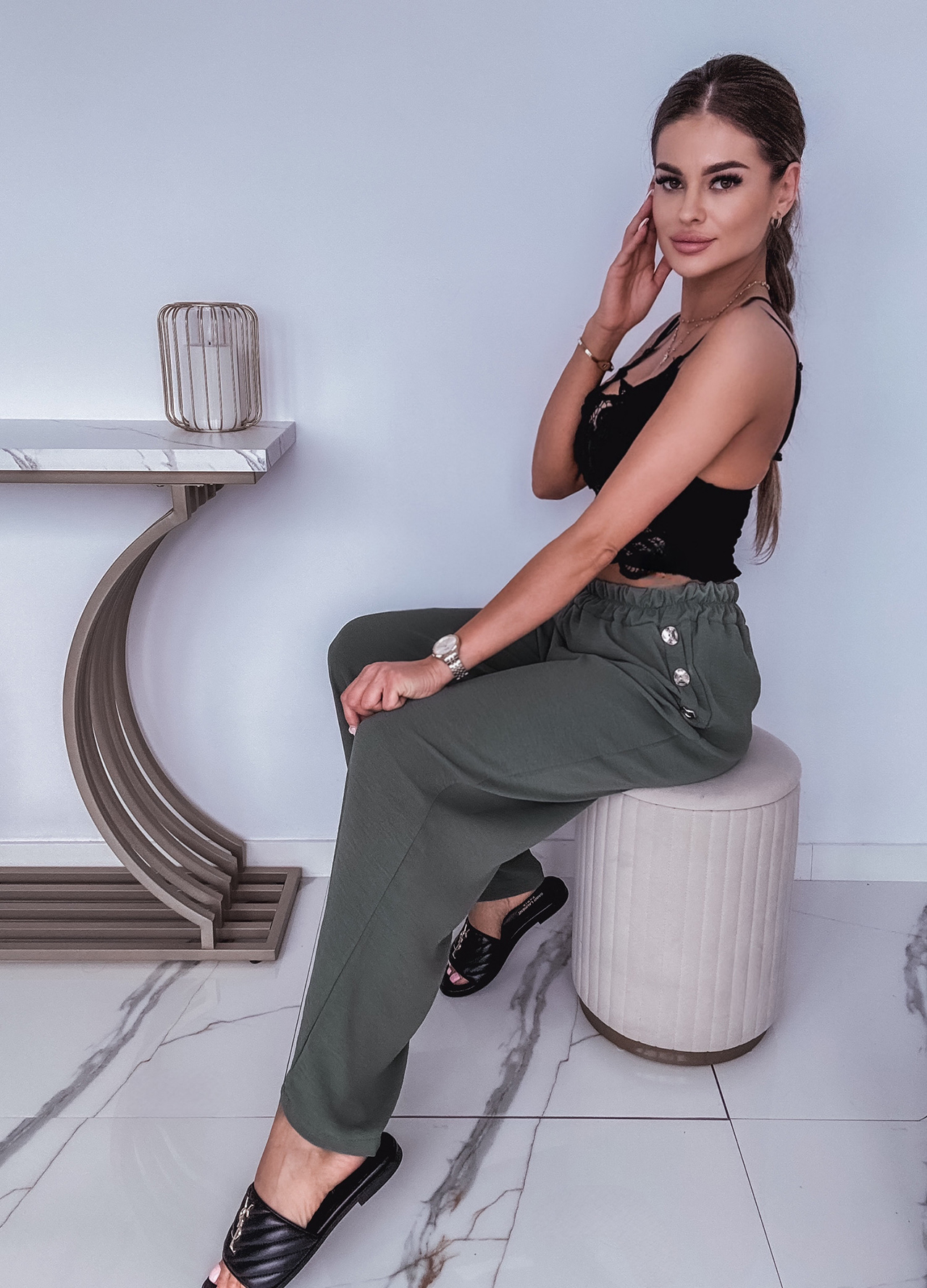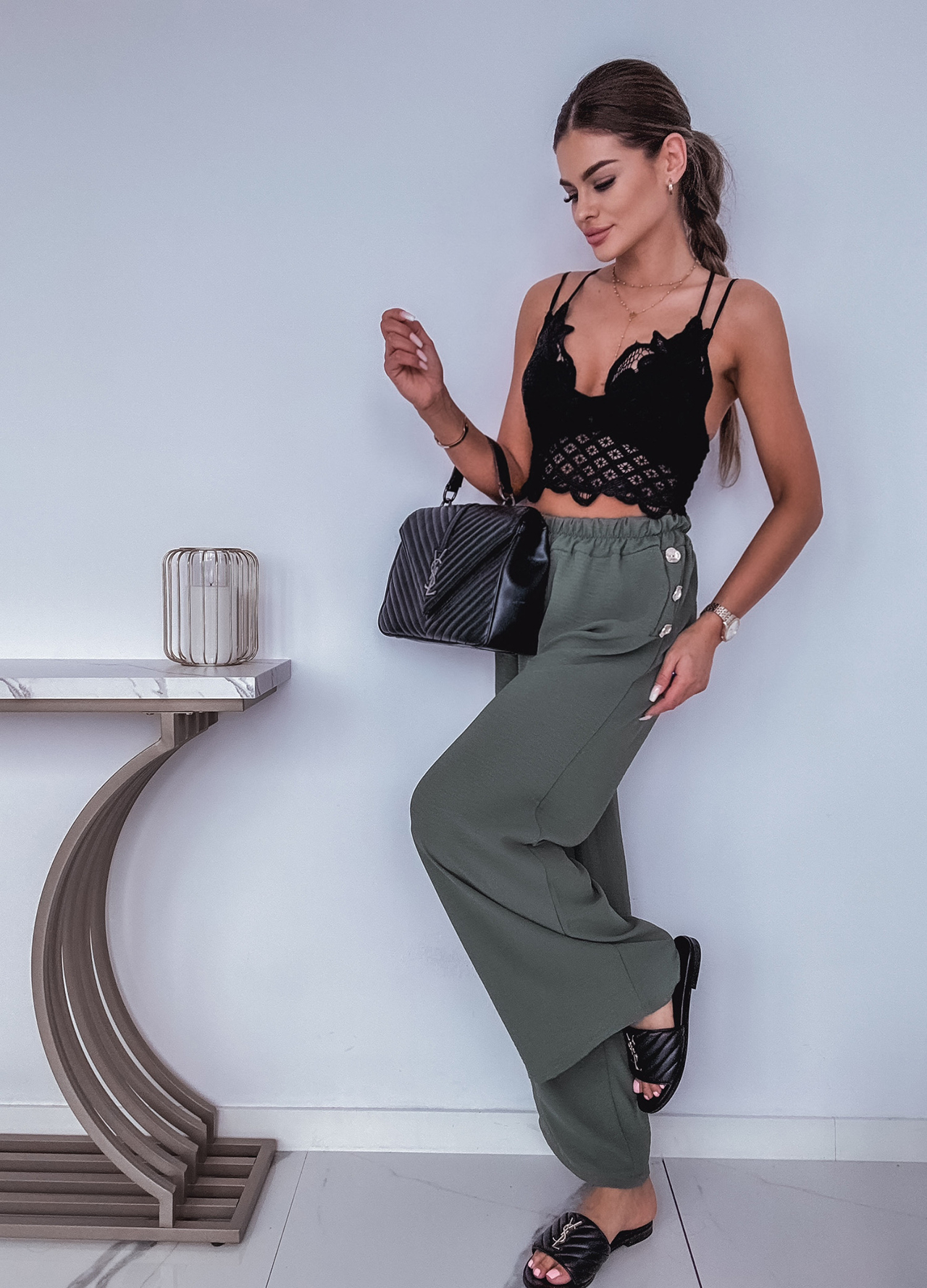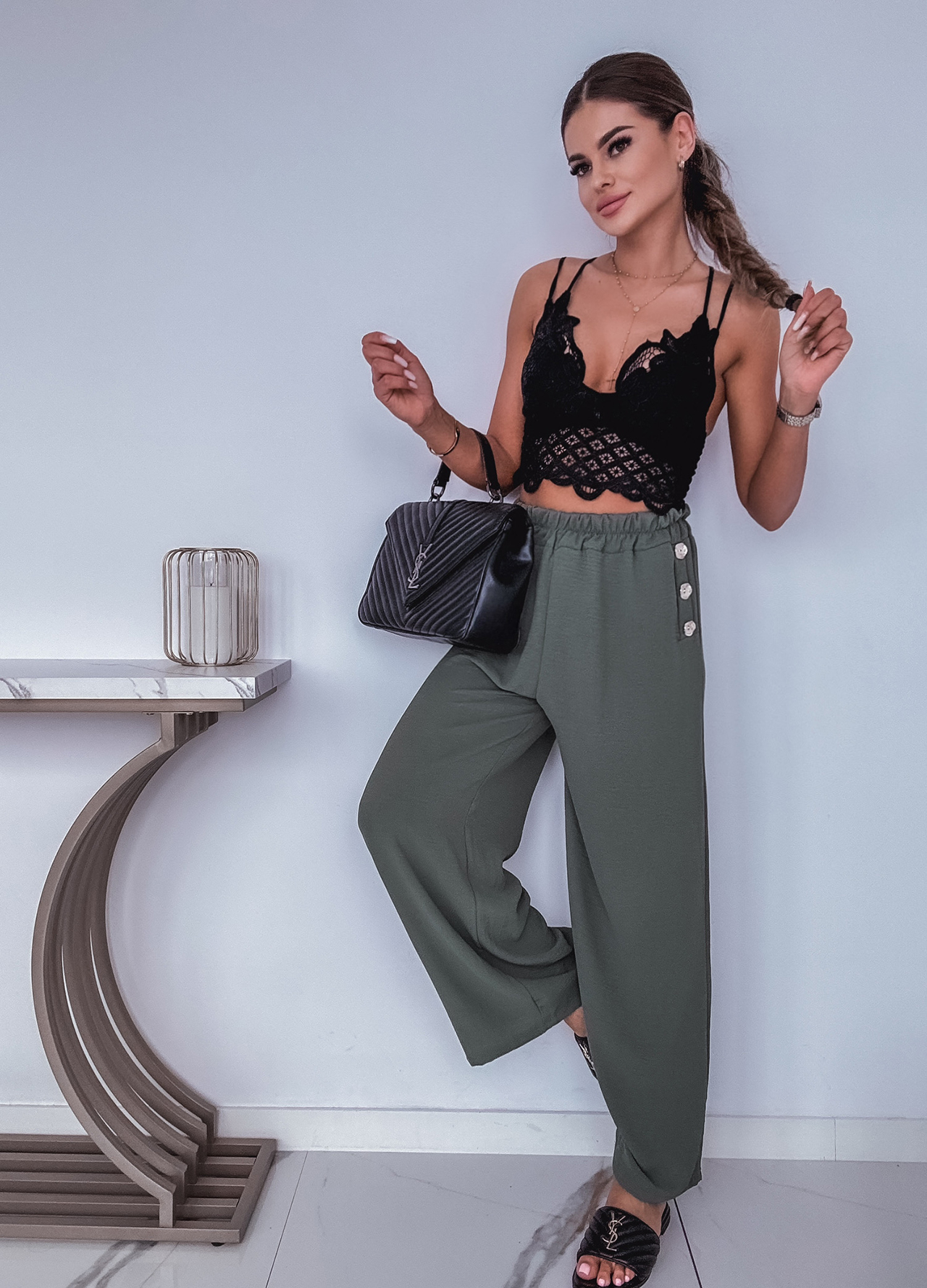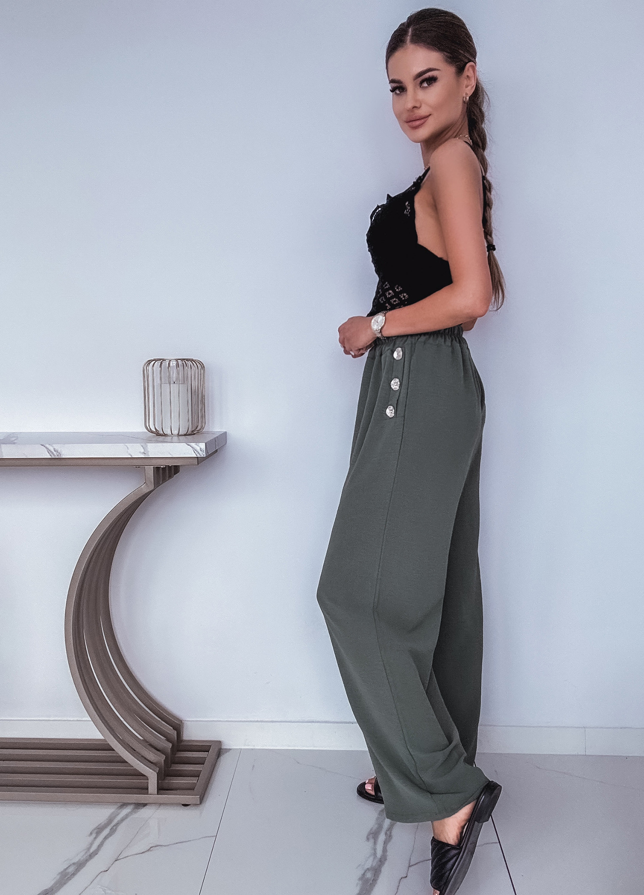 * Szczegóły: Spodnie z szeroką nogawką w kolorze khaki.