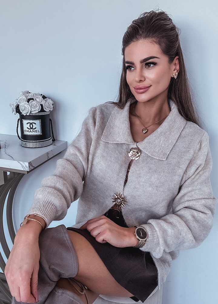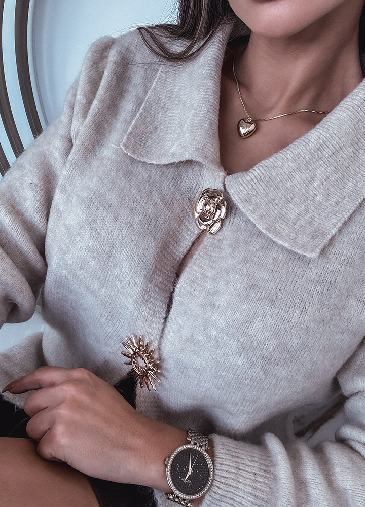 *Wzór: sweter kremowy z ozdobnymi broszkami