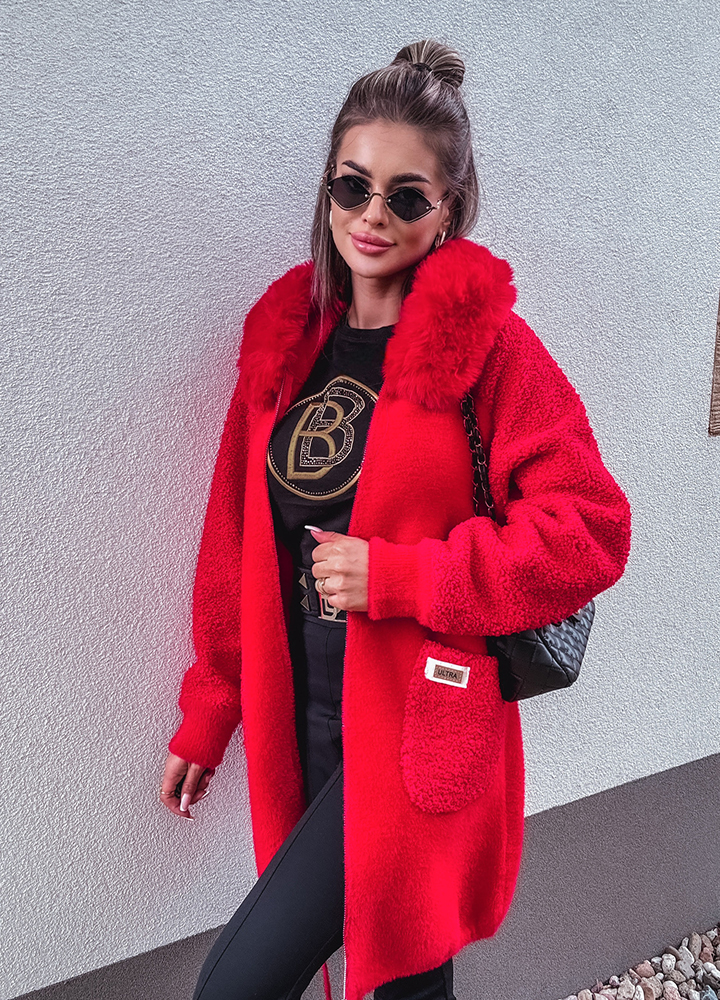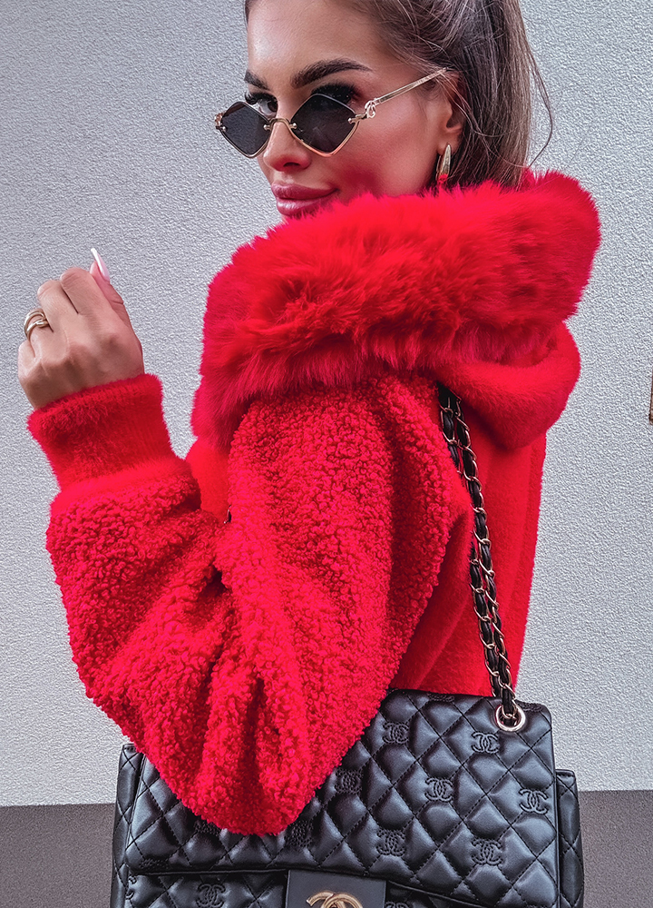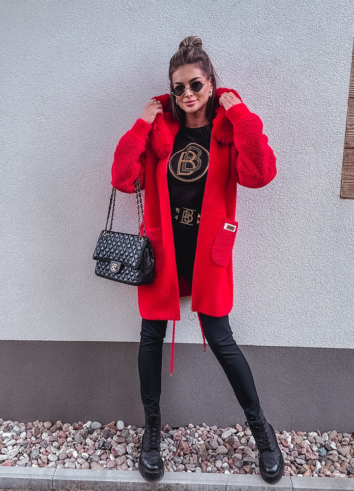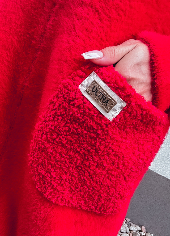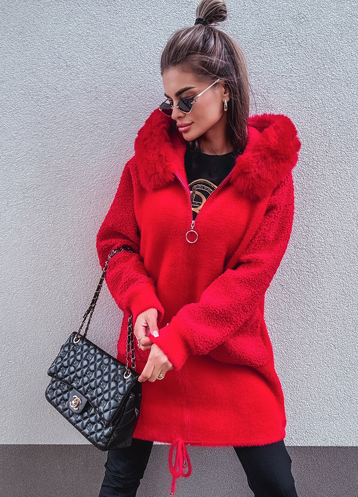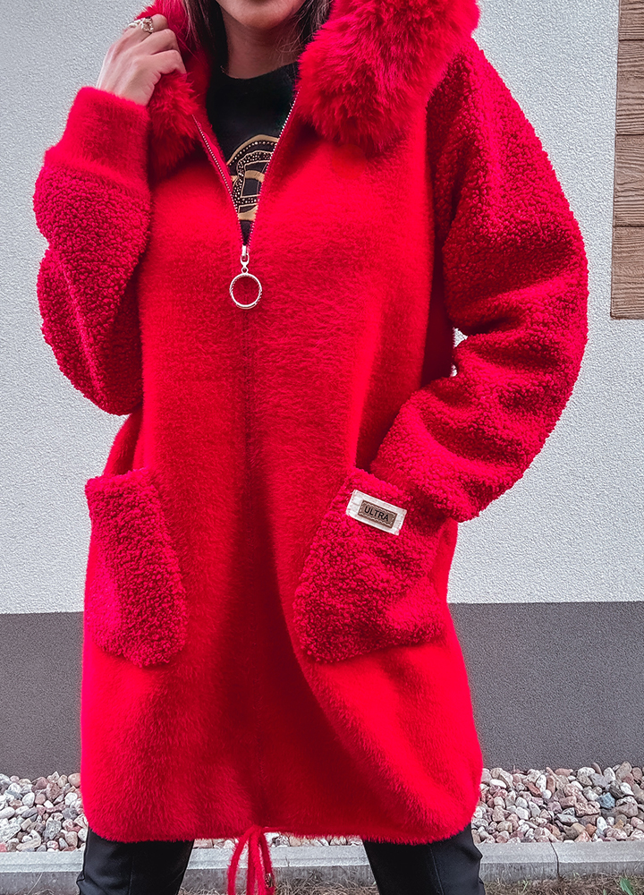 *Wzór: Alpaka czerwona z kapturem , kurtka zapinana na zamek , uszyta z miękkiego materiału z dodatkiem wełny i angory, rozmiar one size