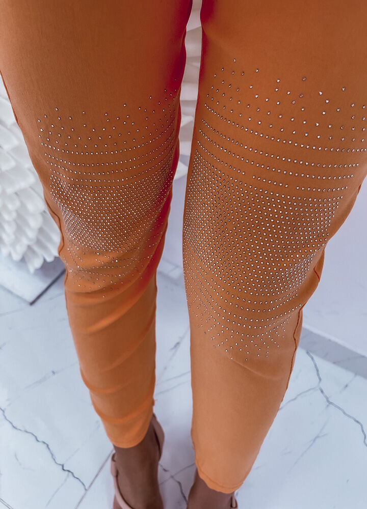 *szczegóły: Wiskozowe spodnie w kolorze pomarańczowym zdobione cekinami.