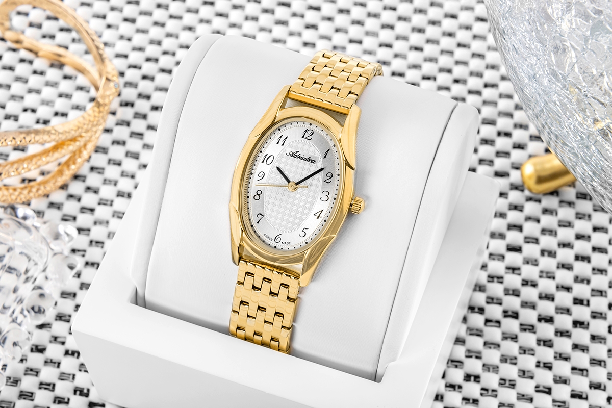 Tarcza tego zegarka zachwyca subtelną grą światła – centralny giloszowany wzór przypomina delikatną tkaninę o geometrycznej strukturze, a jego owalna forma idealnie wpisuje się w nietypowy, eliptyczny kształt koperty. Obrzeże tarczy zostało wykończone satynowaną powierzchnią, która w połączeniu z eleganckimi cyframi arabskimi i smukłymi, czarnymi wskazówkami tworzy kompozycję pełną klasy i równowagi. Logo Adriatica umieszczone pod godziną 12 dodaje całości dyskretnego prestiżu, a detale, takie jak sygnowana koronka i zapięcie, podkreślają dbałość o wykończenie.